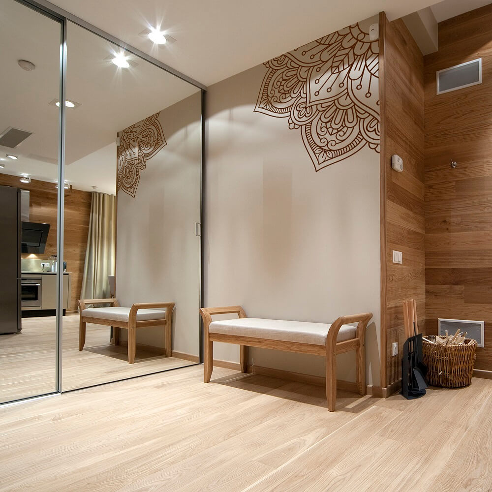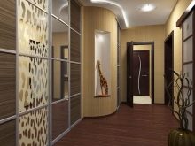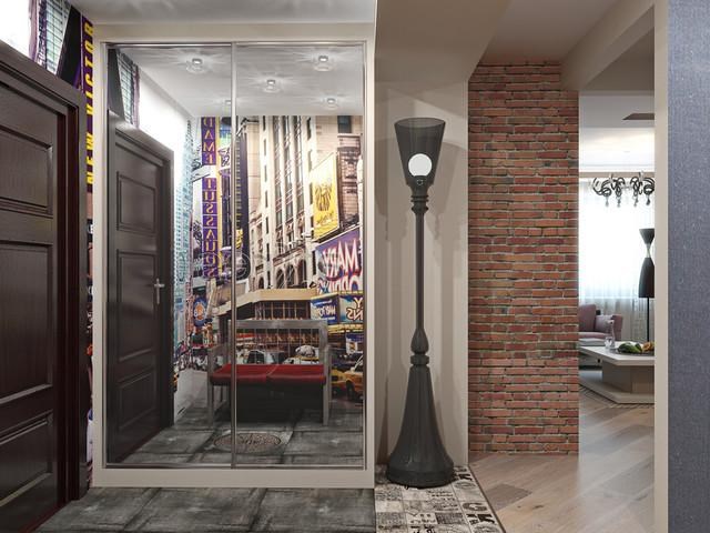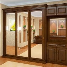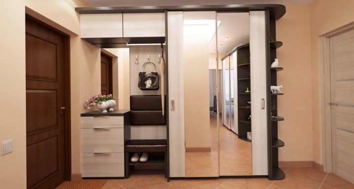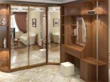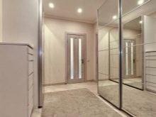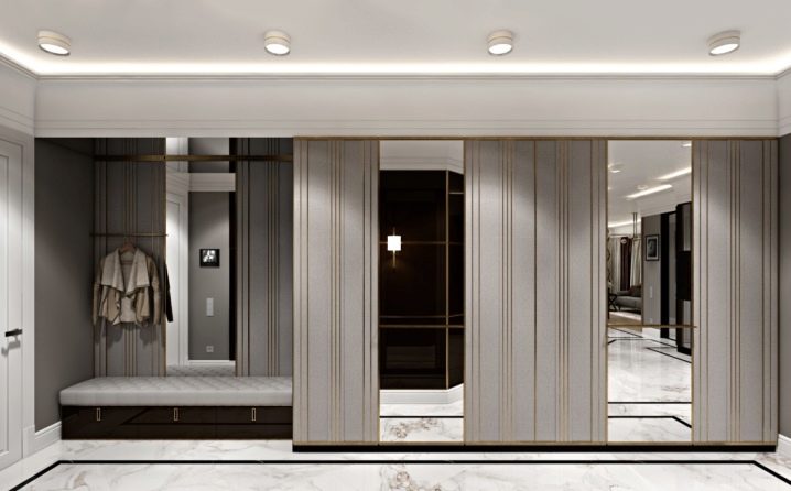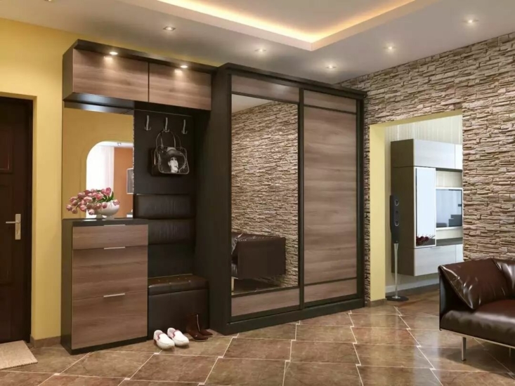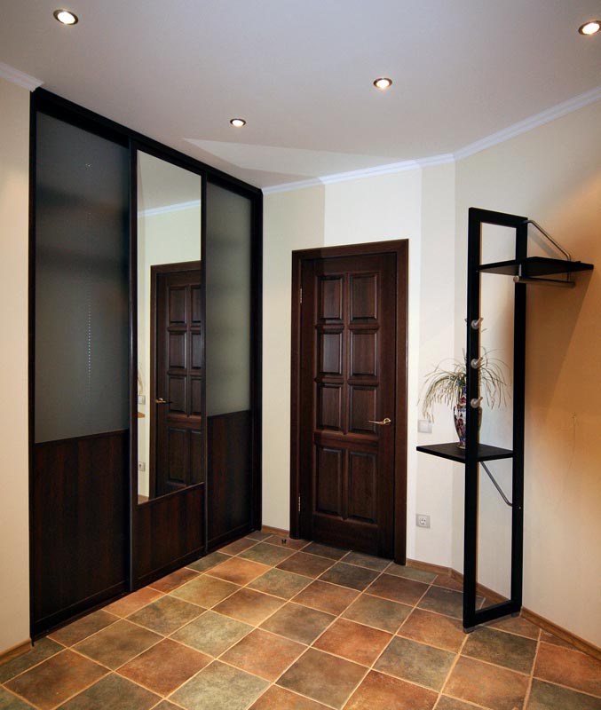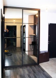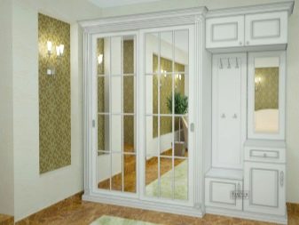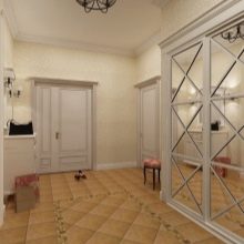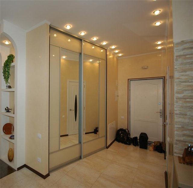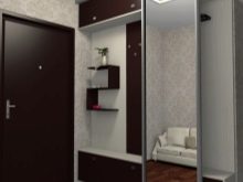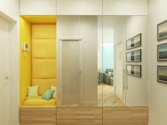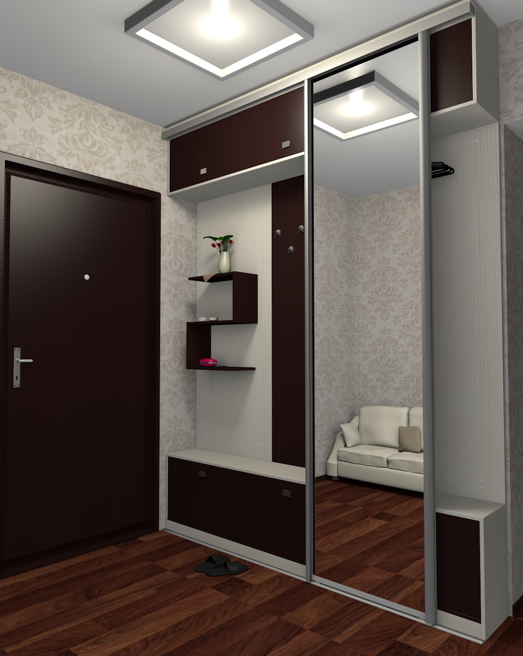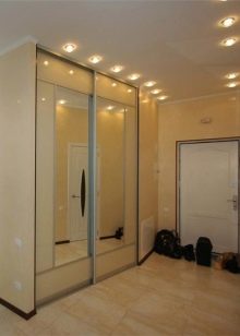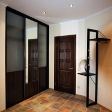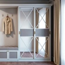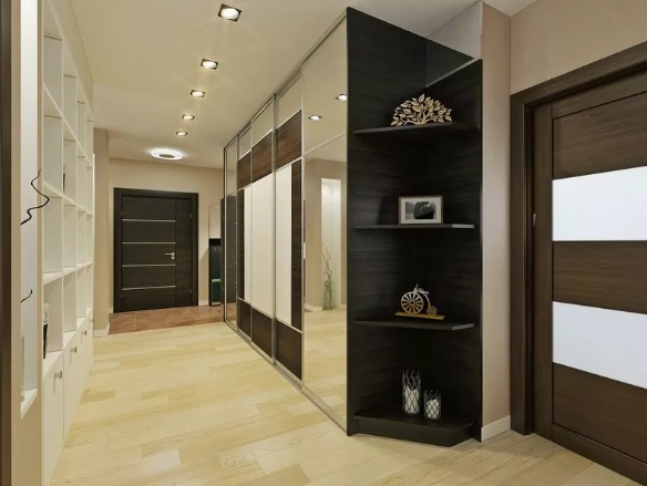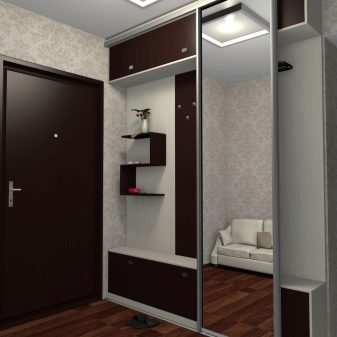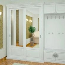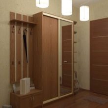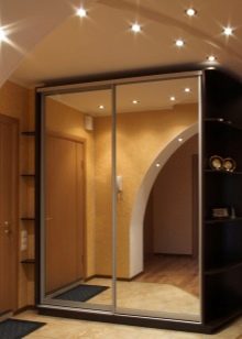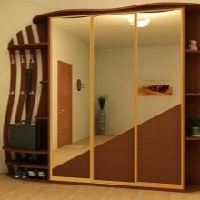 Si le couloir est carré, l'armoire occupe complètement l'un des côtés. Avec un couloir étroit, ils sont placés le long d'un mur plus court. Avec cet agencement, le miroir est souvent situé en face de la porte d'entrée, ce qui contredit les règles du feng shui, mais il corrige avec succès l'espace.