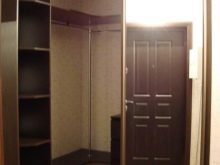 Cet agencement est pratique pour retirer immédiatement les vêtements d'extérieur sur un cintre. Vous pouvez créer une structure dans tout le mur, en vous penchant autour de la porte. En même temps, placez des mezzanines fermées au-dessus. L'espace du couloir n'est pas perturbé, et il y a plus d'espaces de rangement.