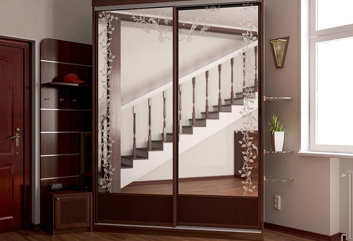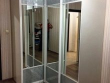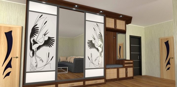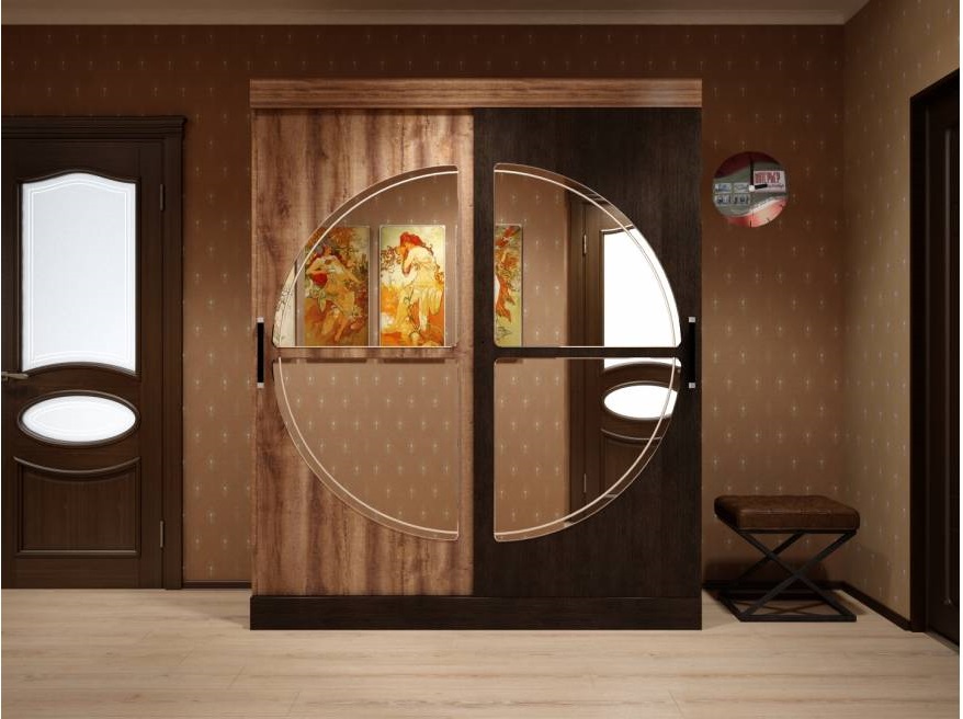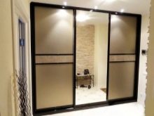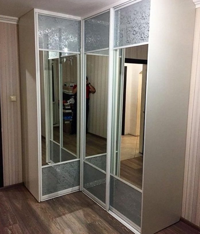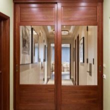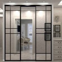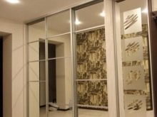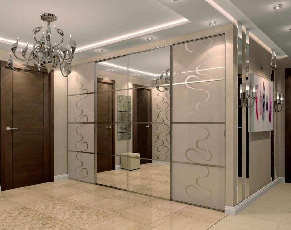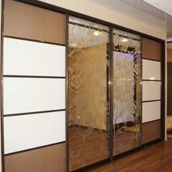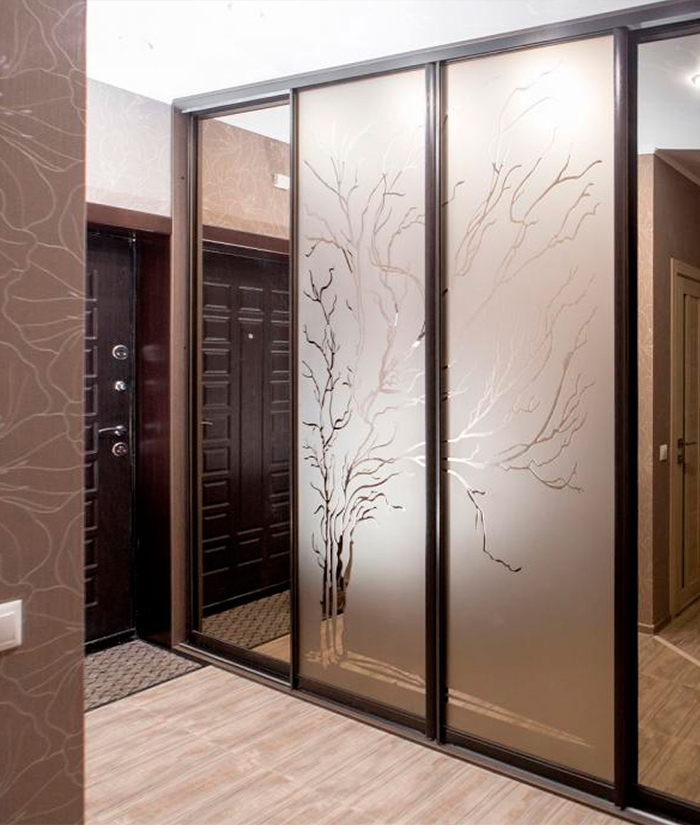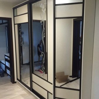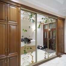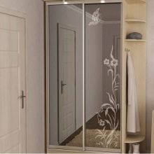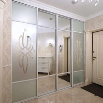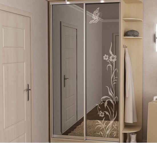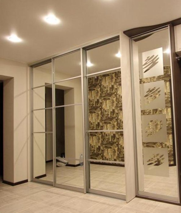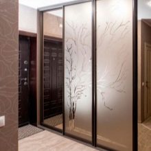Attention particulière aux miroirs. Ils peuvent être avec sablage, impression photo, motif mat. Le miroir lui-même peut être installé sur une porte, par exemple au milieu, ou sur plusieurs. S'il y a deux portes, les inserts de miroir sont souvent disposés verticalement, s'il y en a trois - horizontalement.