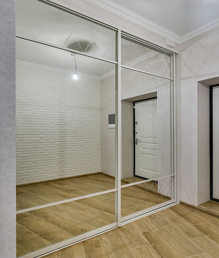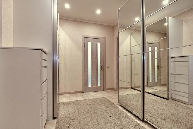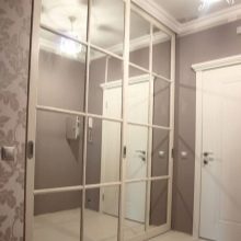 Les portes en miroir fournissent un éclairage supplémentaire en réfléchissant la lumière et agrandissent visuellement l'espace. Dans le même temps, vous pouvez économiser considérablement de l'argent, car vous n'avez pas besoin d'acheter un miroir à part entière et de réfléchir à l'endroit où le placer. Il est d'autant plus agréable que la surface réfléchissante permette d'apprécier l'apparence d'une personne avant d'aller en pleine hauteur.