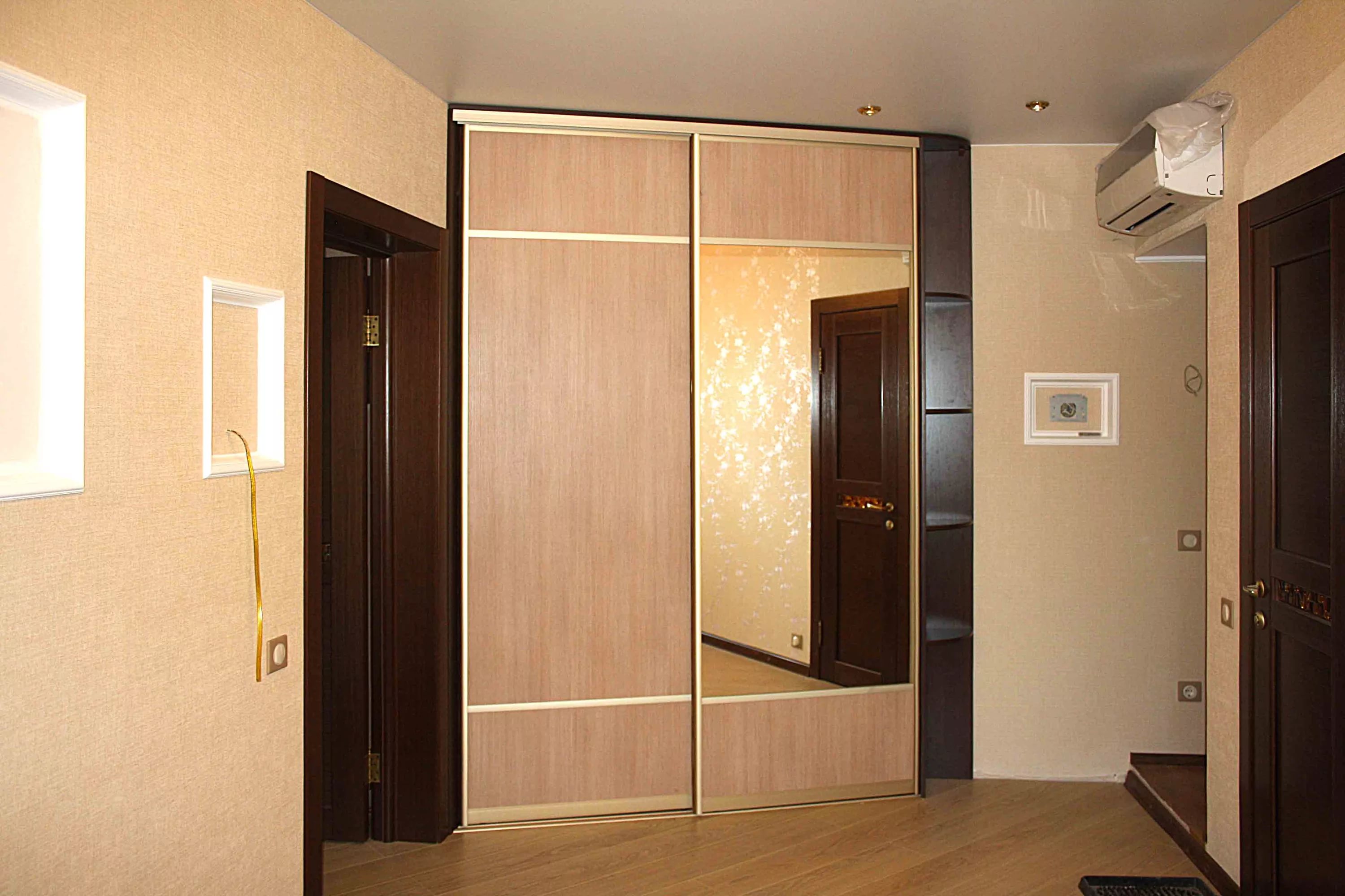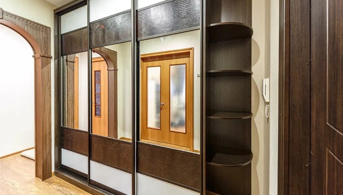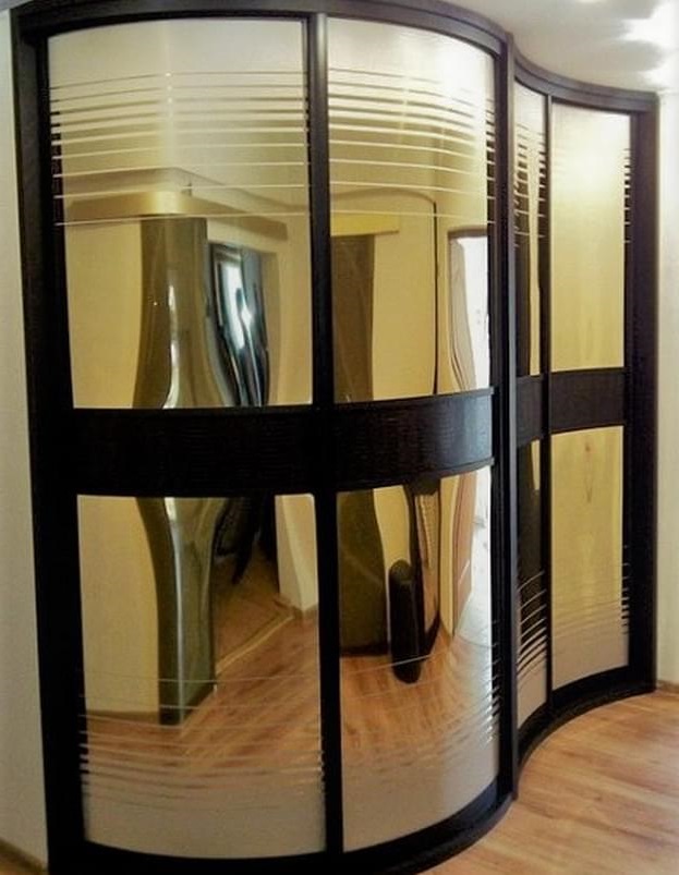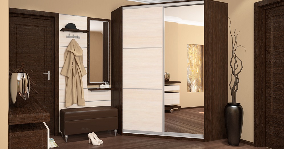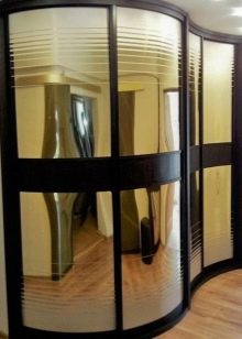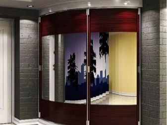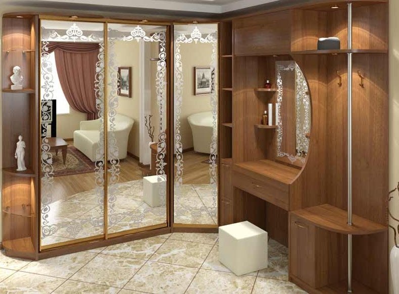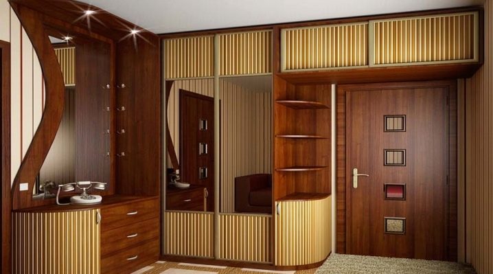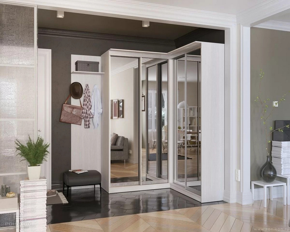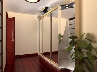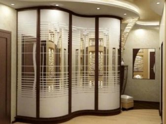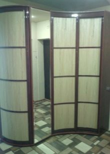 Les modèles d'angle sont situés dans le coin le plus éloigné du couloir. Dans le même temps, les armoires radiales nécessitent relativement plus d'espace, mais vous pouvez visuellement créer un peu d'espace si les portes sont concaves.