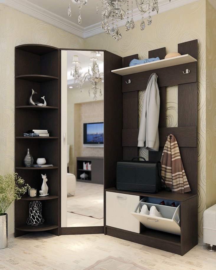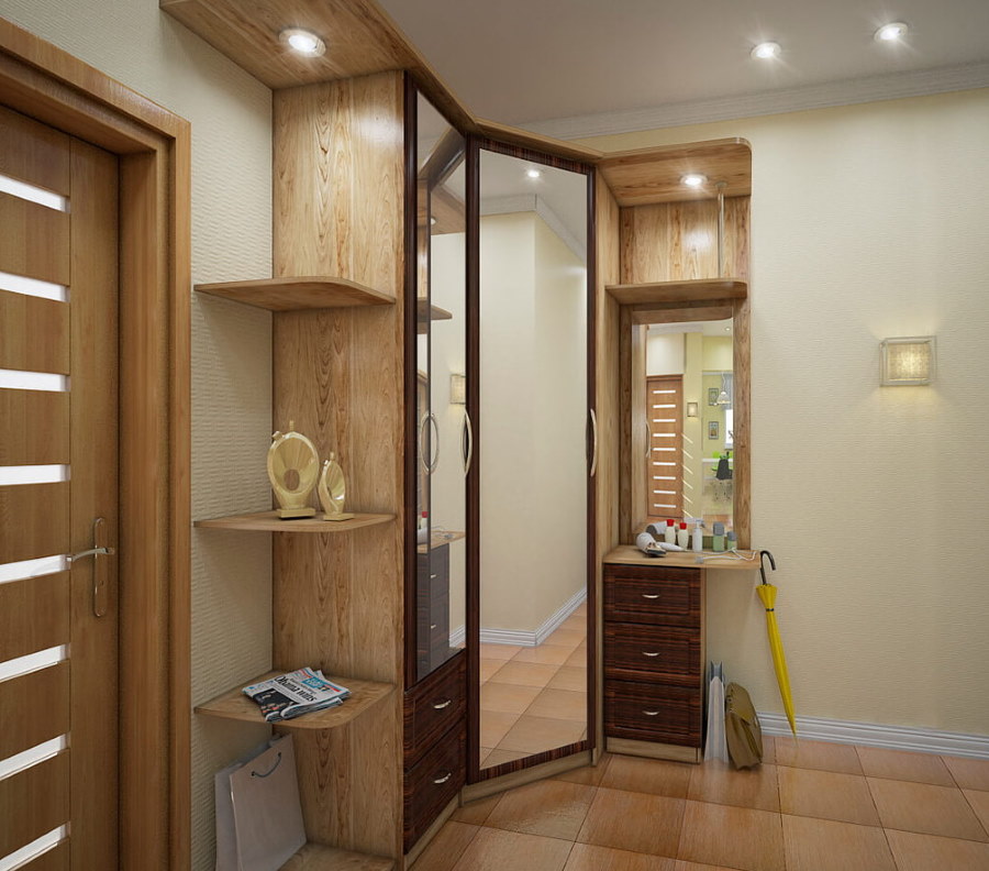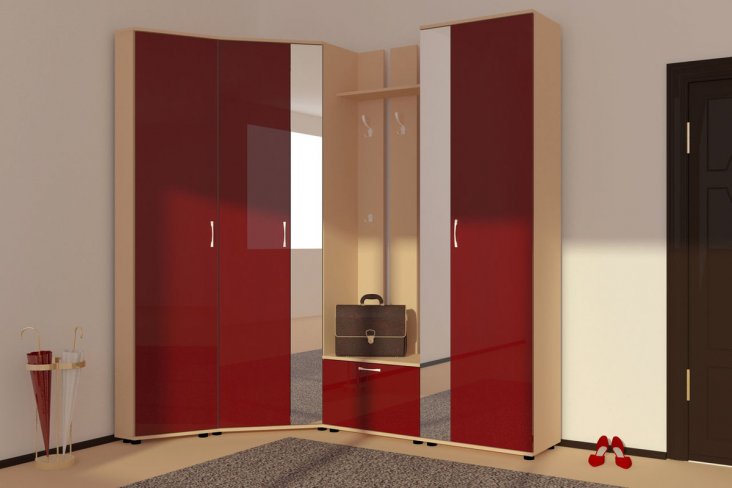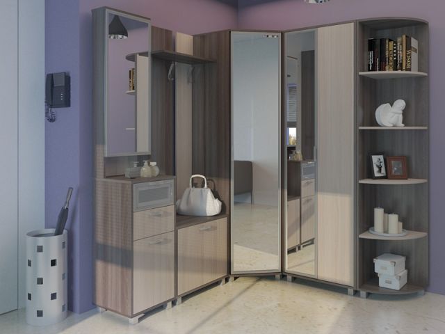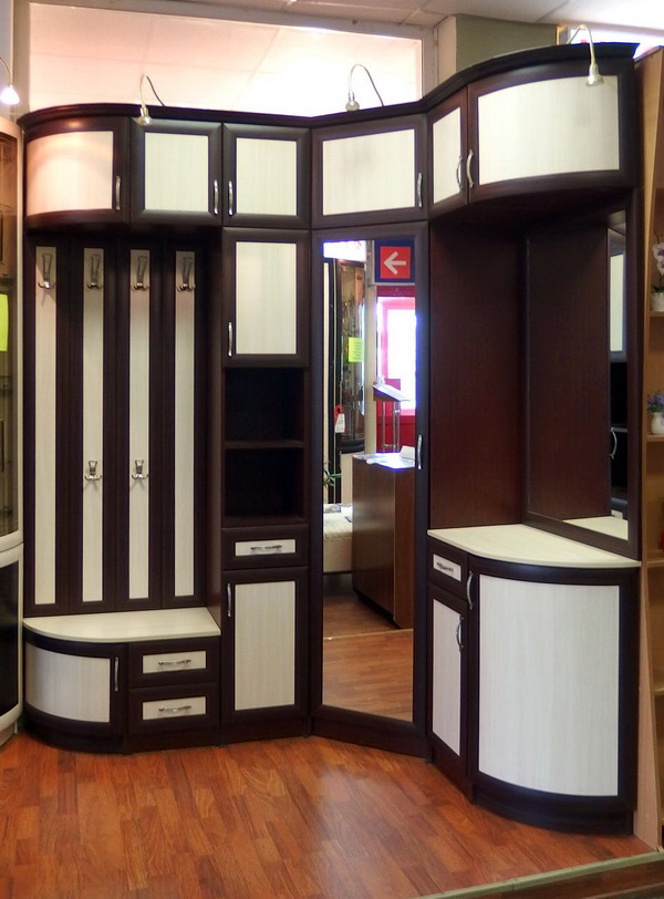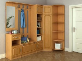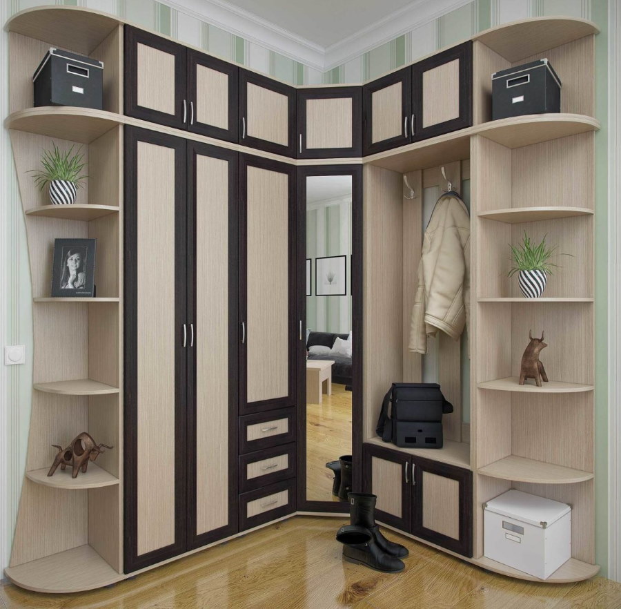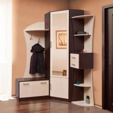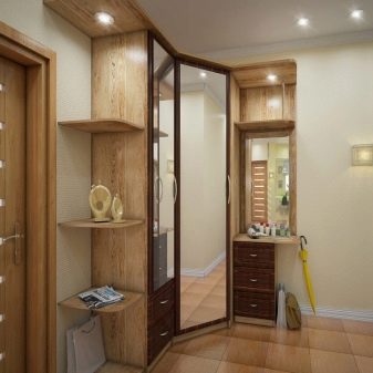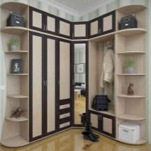 Sur le marché moderne, il existe de nombreuses options pour les armoires qui pourraient s'intégrer dans un couloir d'angle. Les points les plus importants ici sont le gain de place et les aspects esthétiques. Dans le couloir, une version à trois ailes avec un miroir aurait fière allure. Il existe de petites options toutes faites pour de tels couloirs.