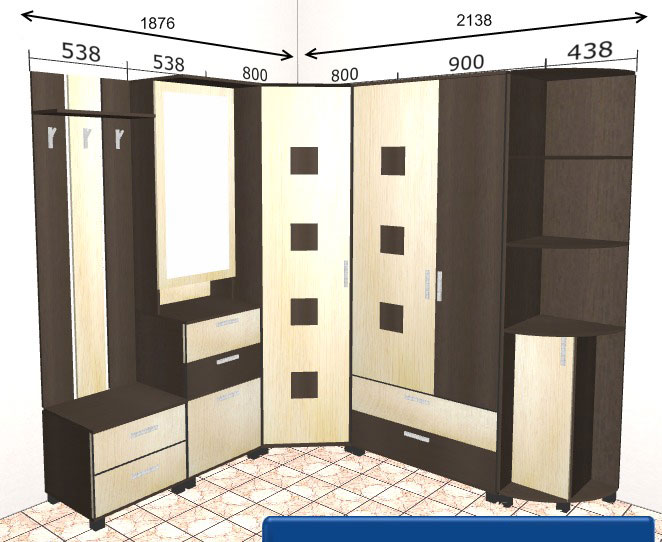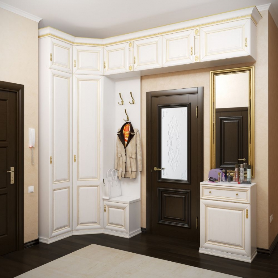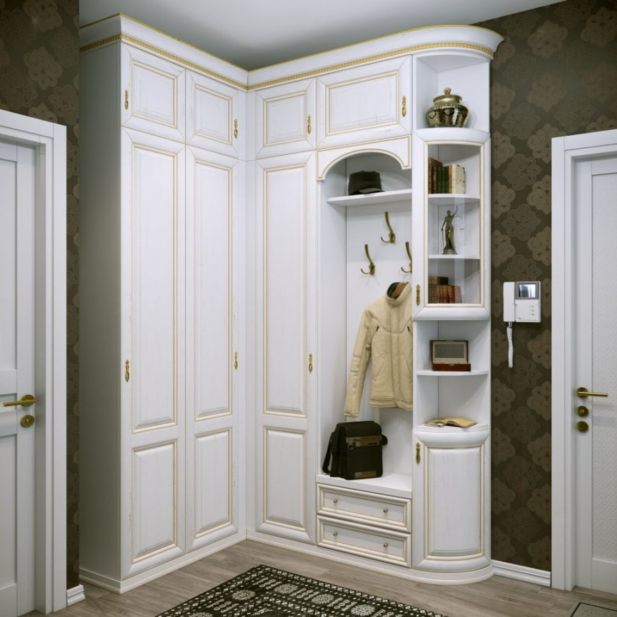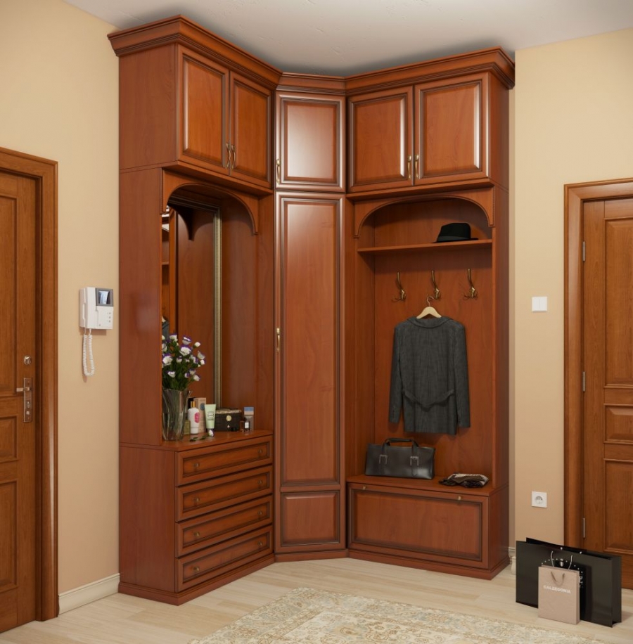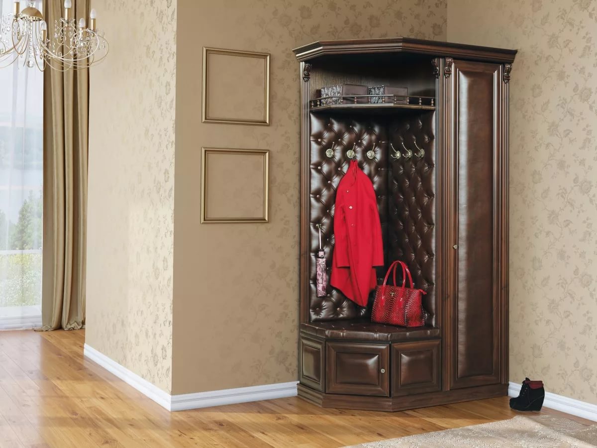 Sur le marché moderne, il existe de nombreuses options pour les armoires qui pourraient s'intégrer dans un couloir d'angle. Les points les plus importants ici sont le gain de place et les aspects esthétiques. Dans le couloir, une version à trois ailes avec un miroir aurait fière allure. Il existe de petites options toutes faites pour de tels couloirs.