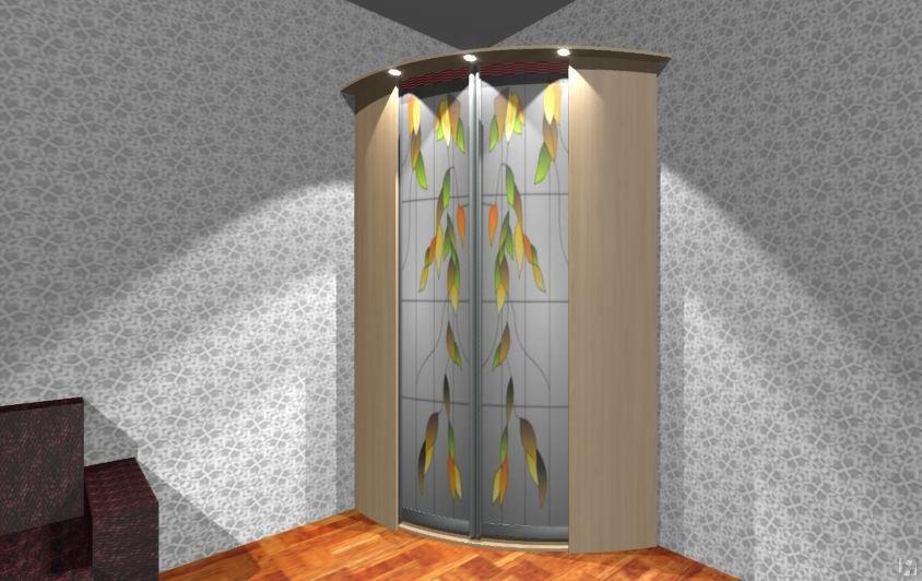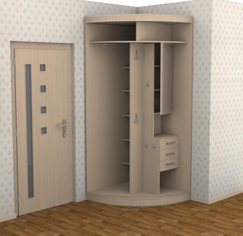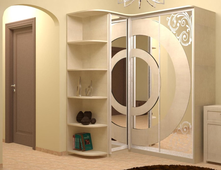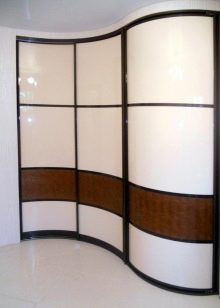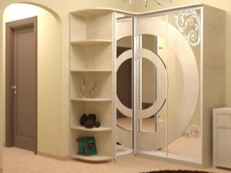 Une armoire incurvée est souvent surdimensionnée. Il existe des modèles avec une étagère à chaussures, etc. En complément, vous pouvez mettre une trousse. Le modèle incurvé, selon les concepteurs, est optimal si le couloir de la maison est carré. Les portes arrondies du coupé donnent l'impression d'un intérieur complet, ce qui est particulièrement attrayant.