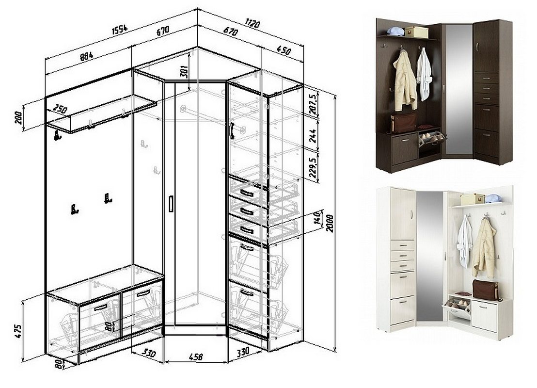 Avant d'acheter des meubles pour un couloir d'angle, vous devrez déterminer la taille de l'espace. Ceci est important, surtout si le produit est fabriqué sur commande. Dans ce cas, afin de tout mesurer avec précision, il est préférable d'appeler le maître. Lorsque la conception d'une armoire d'angle est sélectionnée, vous devez comprendre quelles fonctions les meubles devraient avoir et ce qu'il est prévu d'installer d'autre.