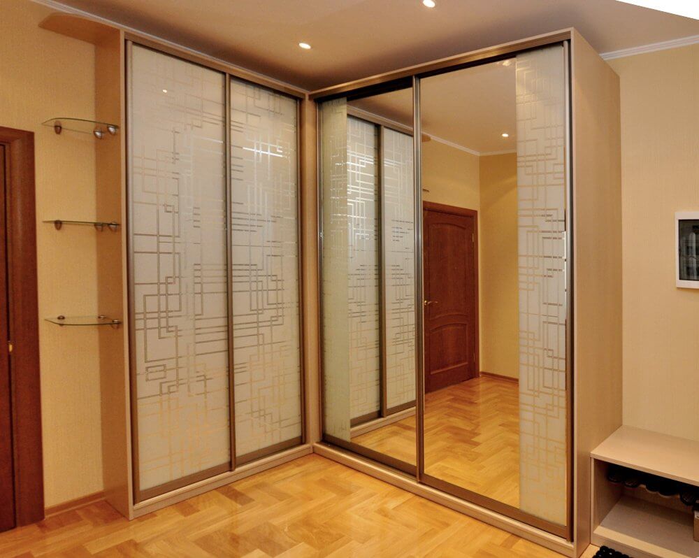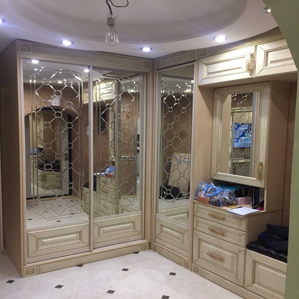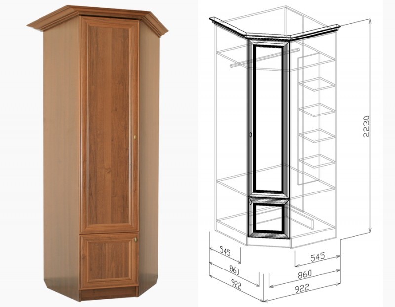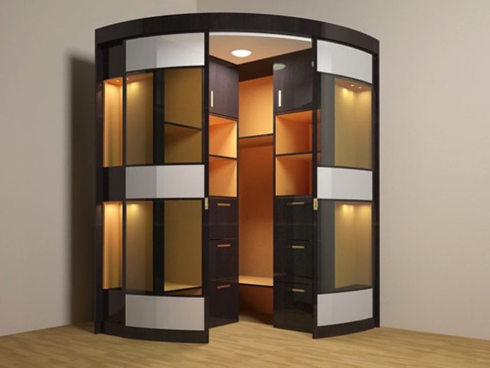 C'est bien quand une pièce est placée juste dans le coin. Dans ce cas, vous obtenez une option de garde-robe qui va dans une niche. N'importe quel nombre d'étagères de rangement et de tiroirs peuvent être placés à l'intérieur.