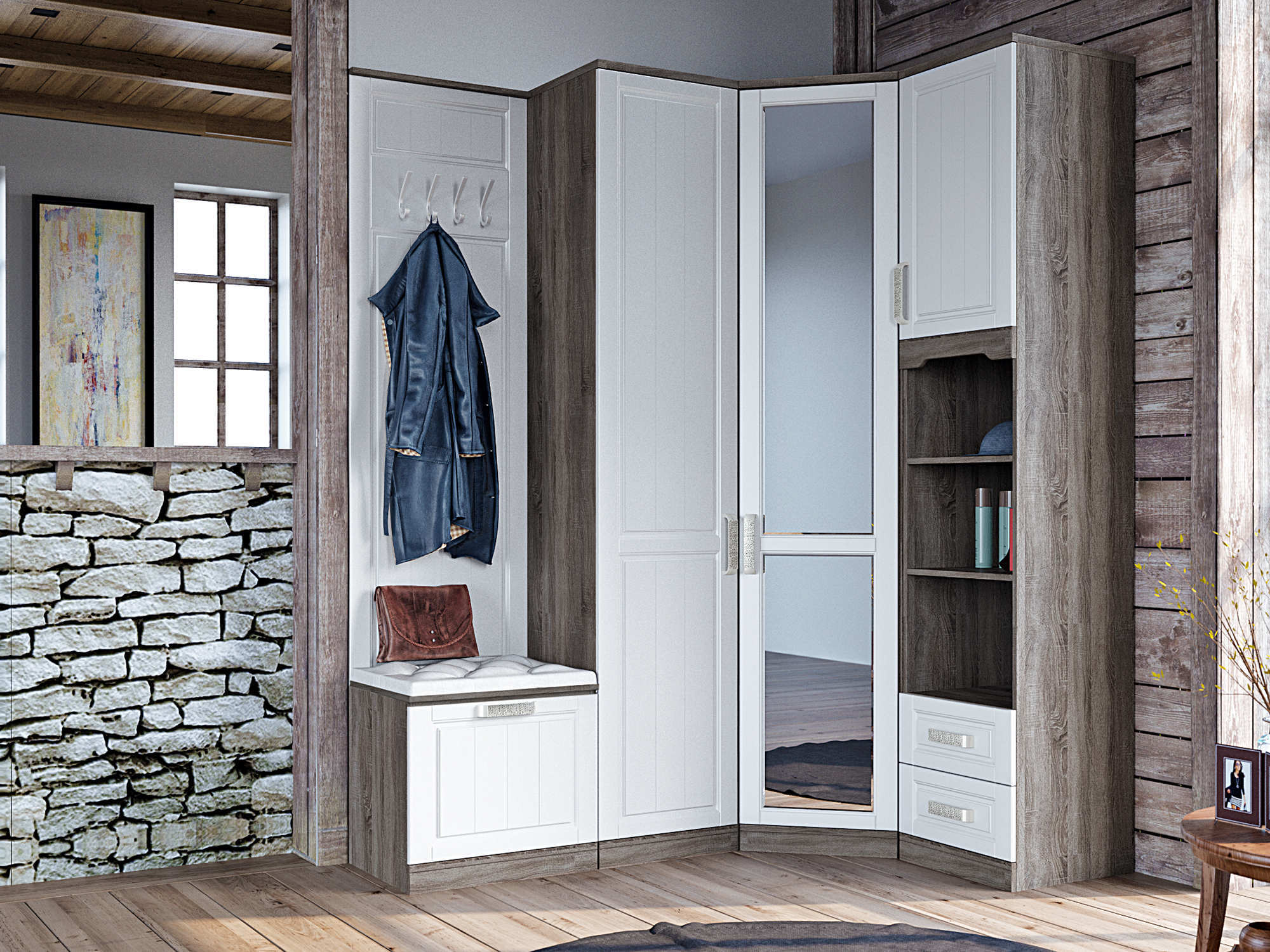 Un bon exemple d'un couloir d'angle clair. Il y a tout ce dont vous avez besoin pour un maximum de confort. Un miroir assorti au reste du mobilier s'intègre harmonieusement dans l'ensemble.
