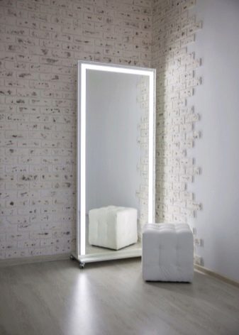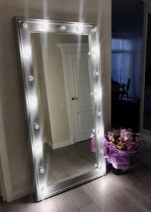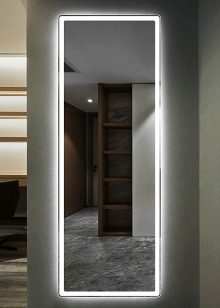 Si le couloir est modeste et petit et qu'il y a un espace libre sur le mur, il est préférable d'accrocher le miroir éclairé et de ne pas le poser au sol. En tant que base, non seulement les murs conviennent, mais également les portes d'armoires, les étagères à chaussures, etc. Les options de suspension ne sont pas moins attrayantes et élégantes.