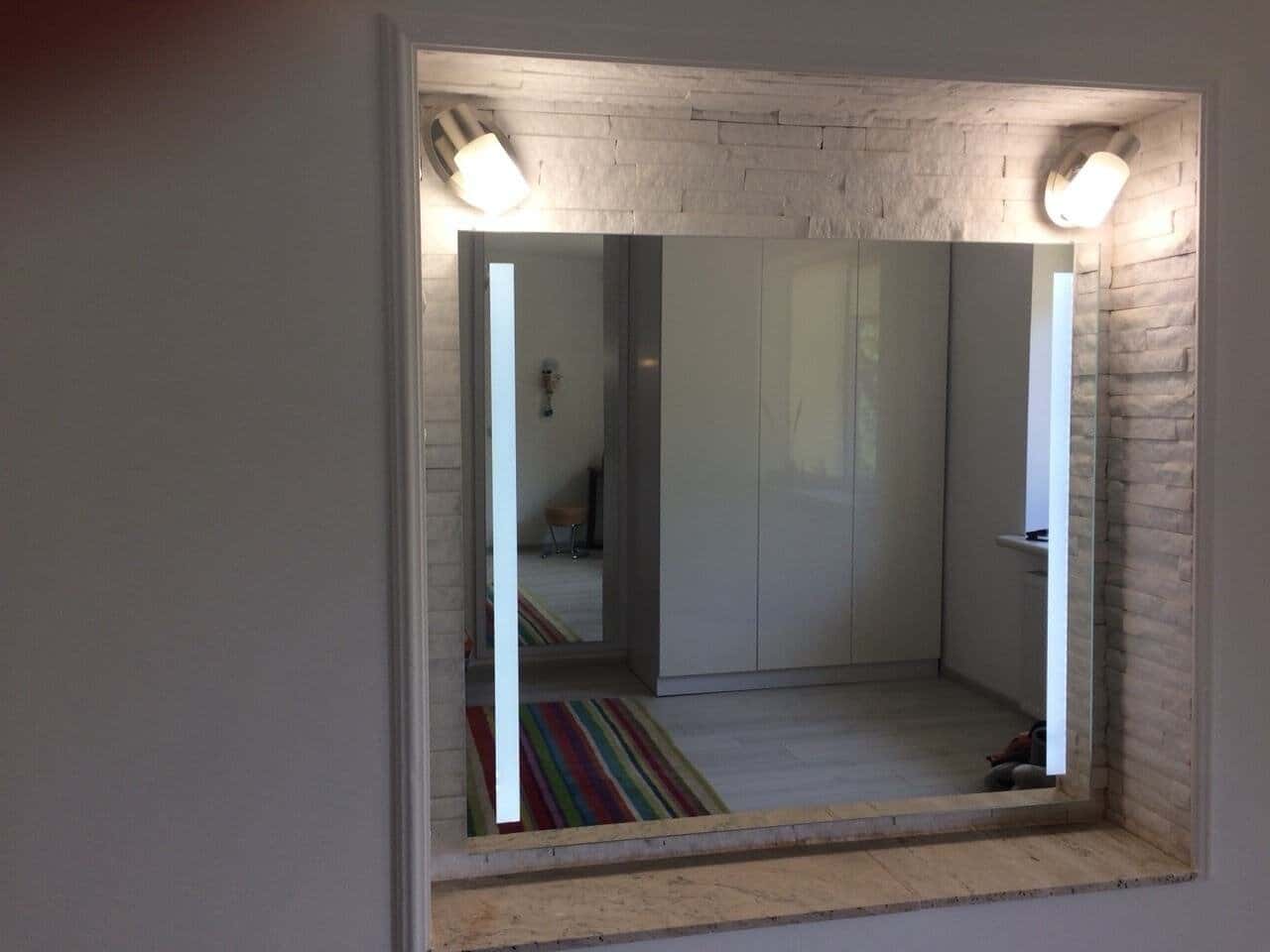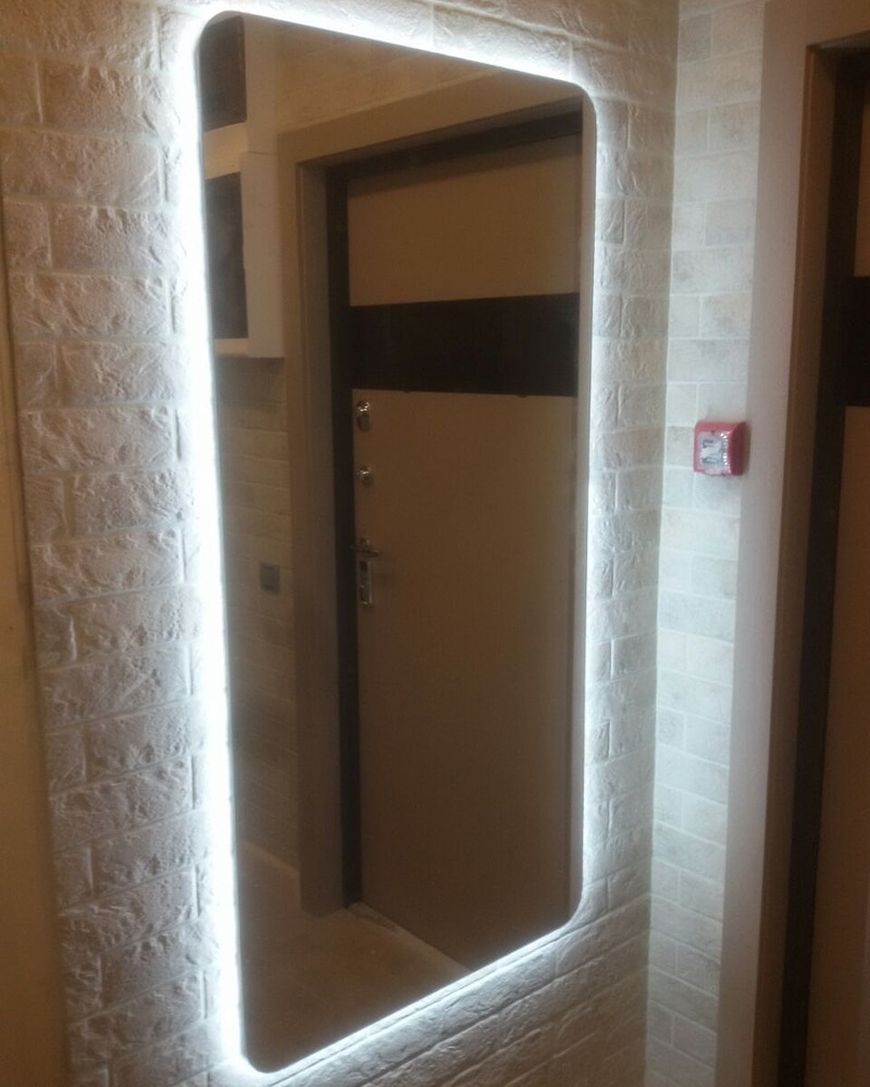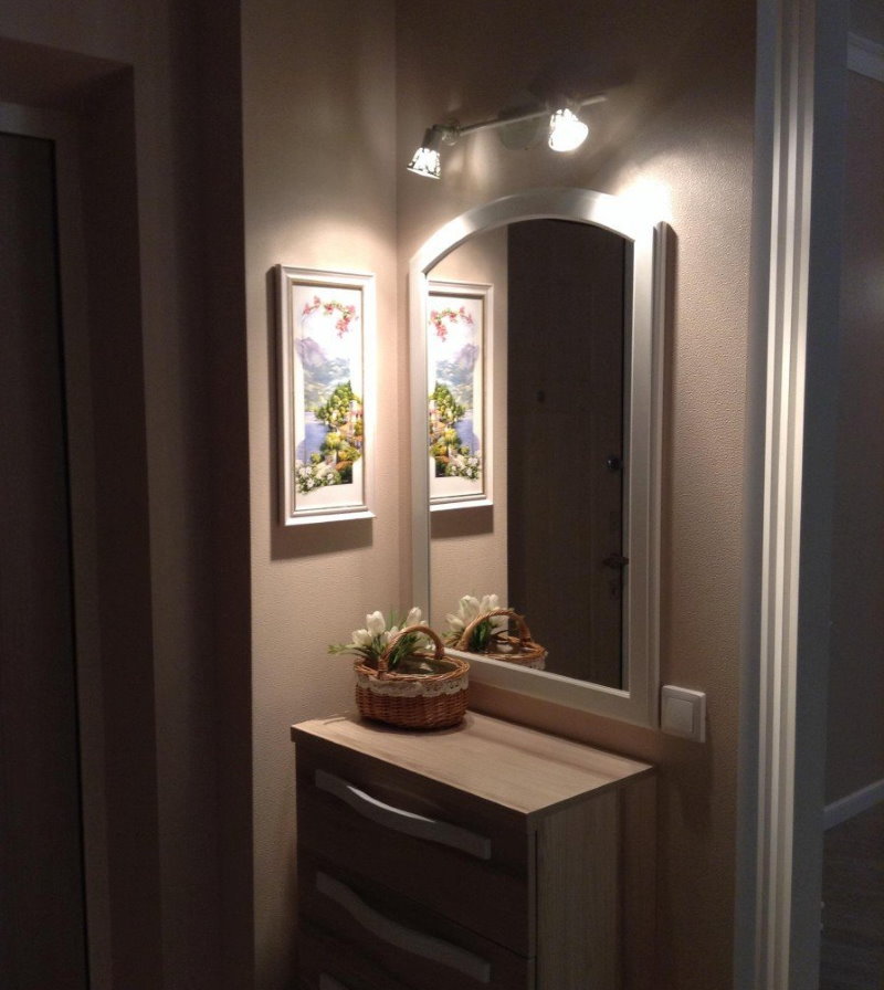 - La solution la plus populaire consiste à installer un miroir lumineux mural juste à côté de la porte d'entrée. Lors du choix d'un tel endroit, il est très important de s'assurer que le miroir reste protégé des chocs accidentels et du contact avec d'autres objets.