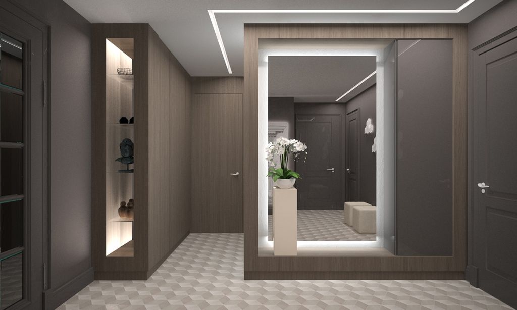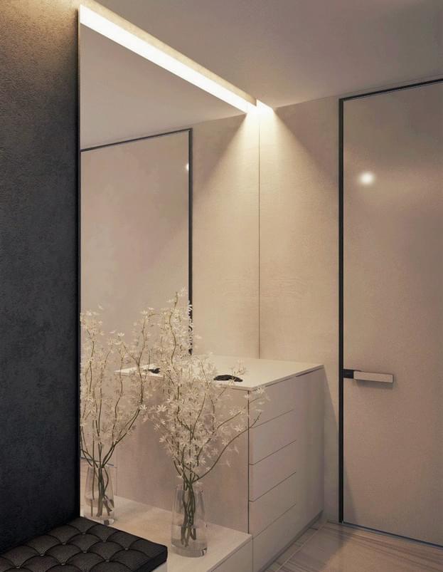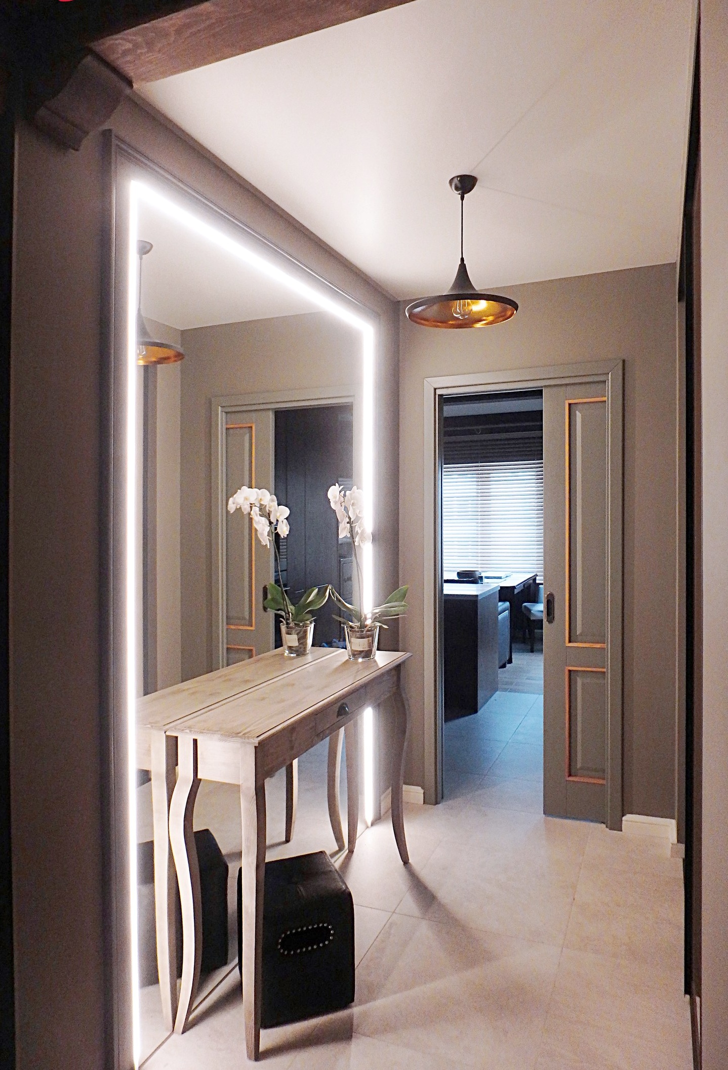 - Hall d'entrée élégant et spacieux, fini dans des couleurs claires neutres, peut être complété par un grand miroir pleine longueur. Cet élément sera particulièrement impressionnant lorsqu'il sera combiné avec un cadre baguette. Le miroir de luxe peut être éclairé avec une petite suspension installée directement au-dessus, ainsi qu'avec un éclairage LED intégré qui s'étend sur tout le plafond.