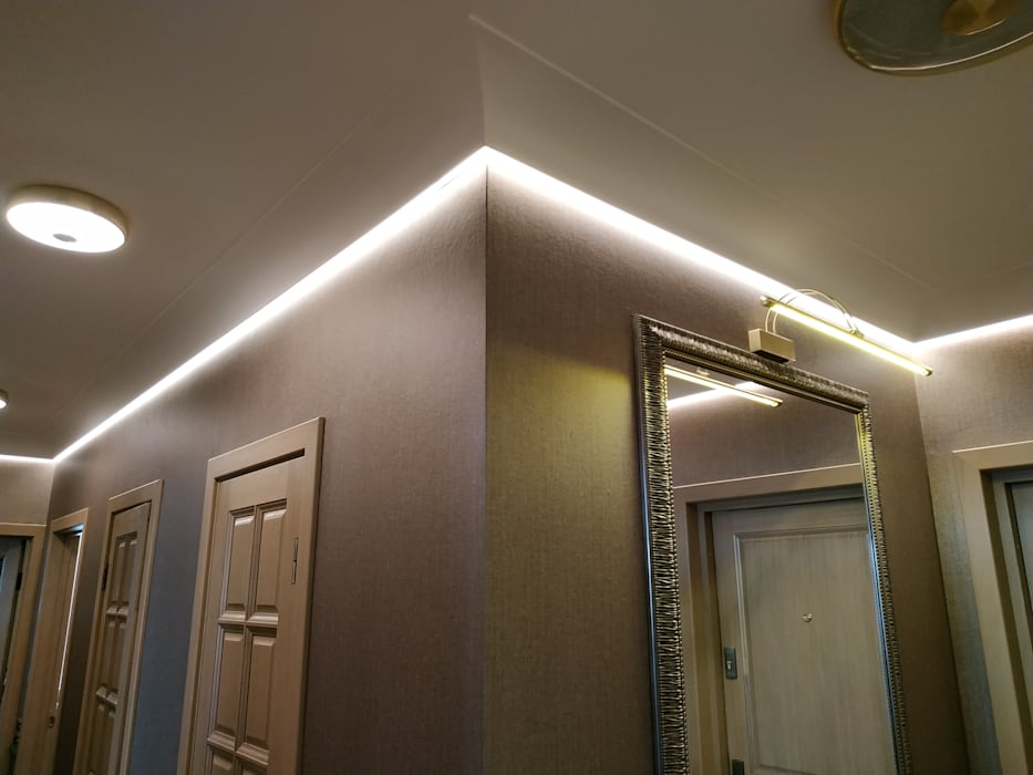 - Une solution efficace et stylée consiste à placer un produit avec éclairage dans une niche spécialement aménagée à cet effet. Souvent, cette méthode d'installation est utilisée pour équiper des couloirs petits et étroits.