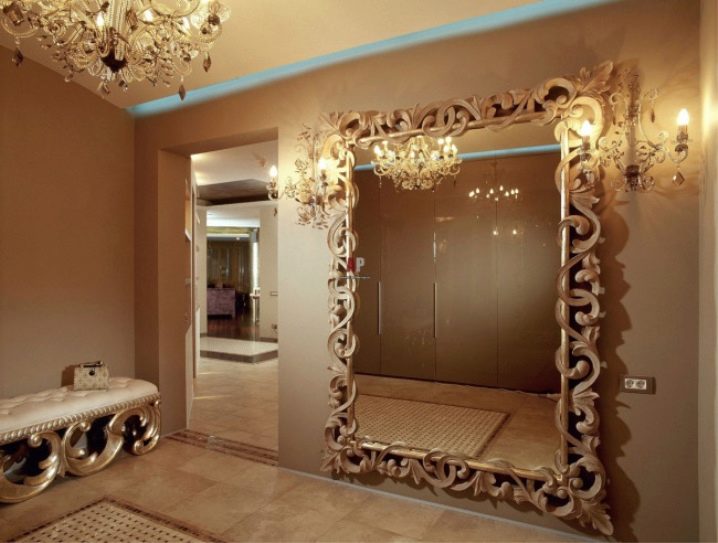 - Dans un hall d'entrée luxueux et spacieux, conçu dans un style prétentieux, vous pouvez accrocher un immense miroir solide, encadré par un cadre doré chic avec de nombreux détails à motifs complexes. En tant qu'éclairage coûteux, il est permis d'utiliser des appliques murales solides de formes gracieuses. En combinaison avec l'élément considéré, un banc lumineux spectaculaire avec des pieds dorés à motifs, ainsi qu'un lustre de plafond volumineux avec des pendentifs, apparaîtront harmonieusement ici.