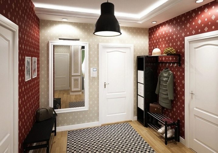 - Le couloir peut être décoré de manière très lumineuse et originale. Par exemple, une combinaison de décoration murale blanche et rouge, associée à un plafond blanc comme neige à plusieurs niveaux, complétée par une bande LED, sera élégante. Dans un tel cadre, il y a une place pour un miroir rectangulaire strict avec un cadre blanc et un éclairage dans la partie supérieure.