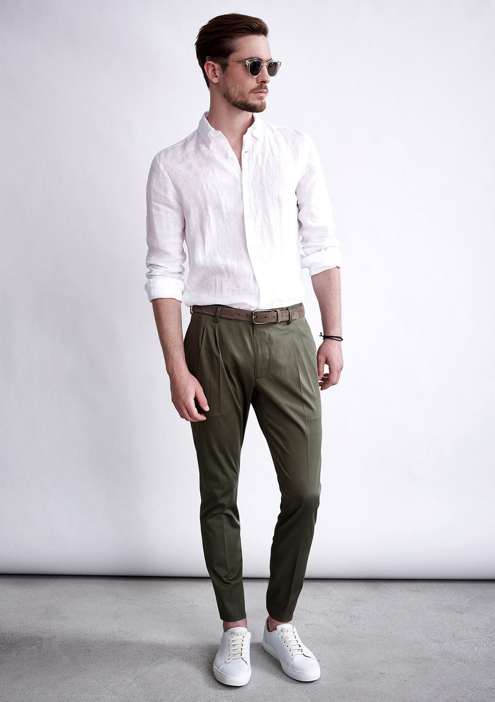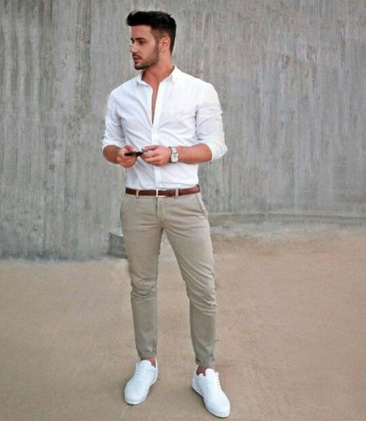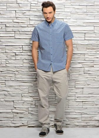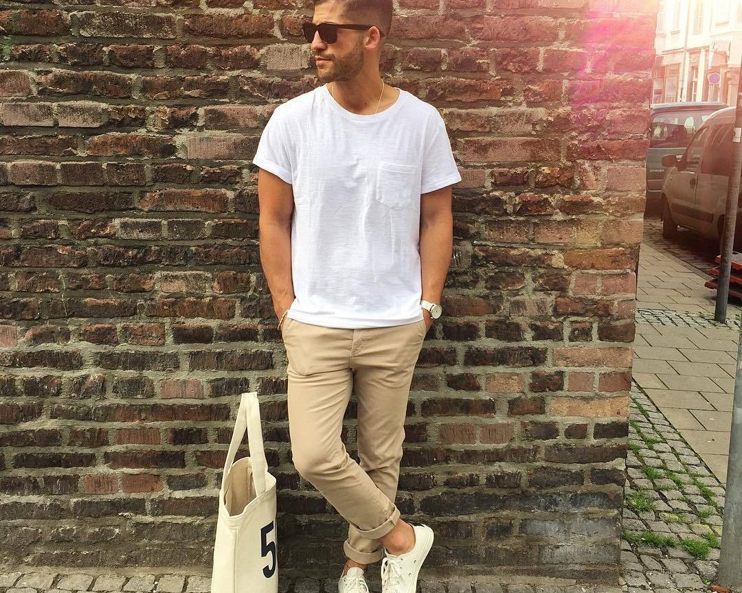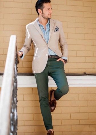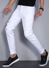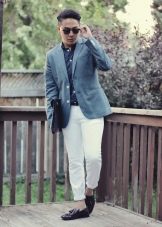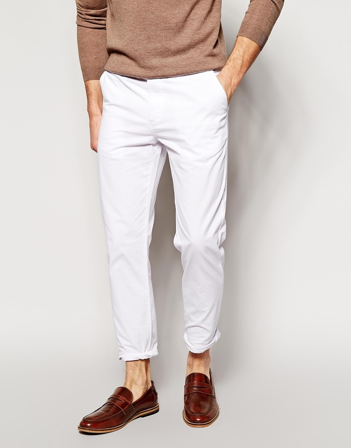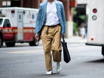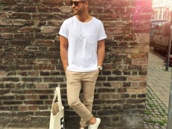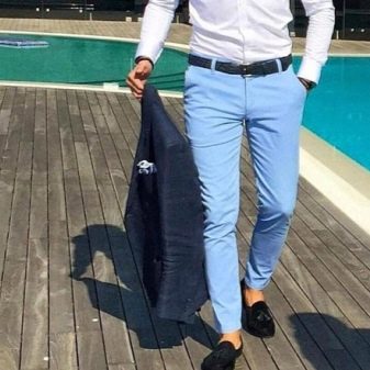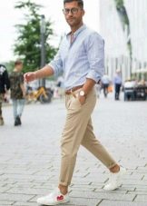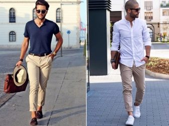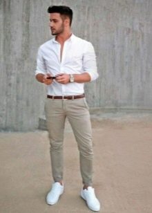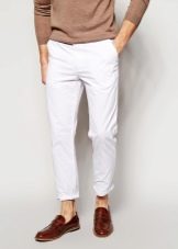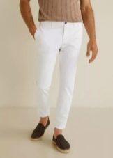 - Branco chino - uma opção de verão ideal para um homem jovem e autoconfiante. Costuma-se usá-los esgalgados, combiná-los com camisas ou moletons, complementando-os com uma jaqueta folgada ou uma jaqueta leve curta.