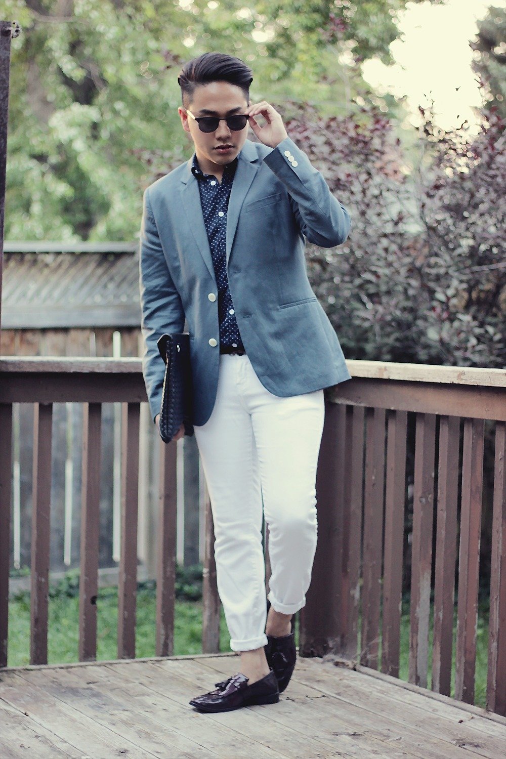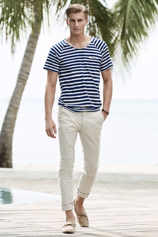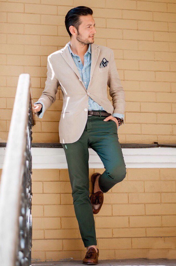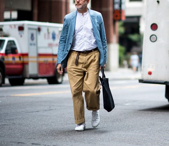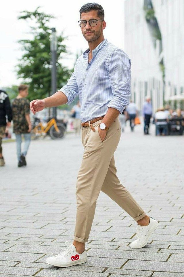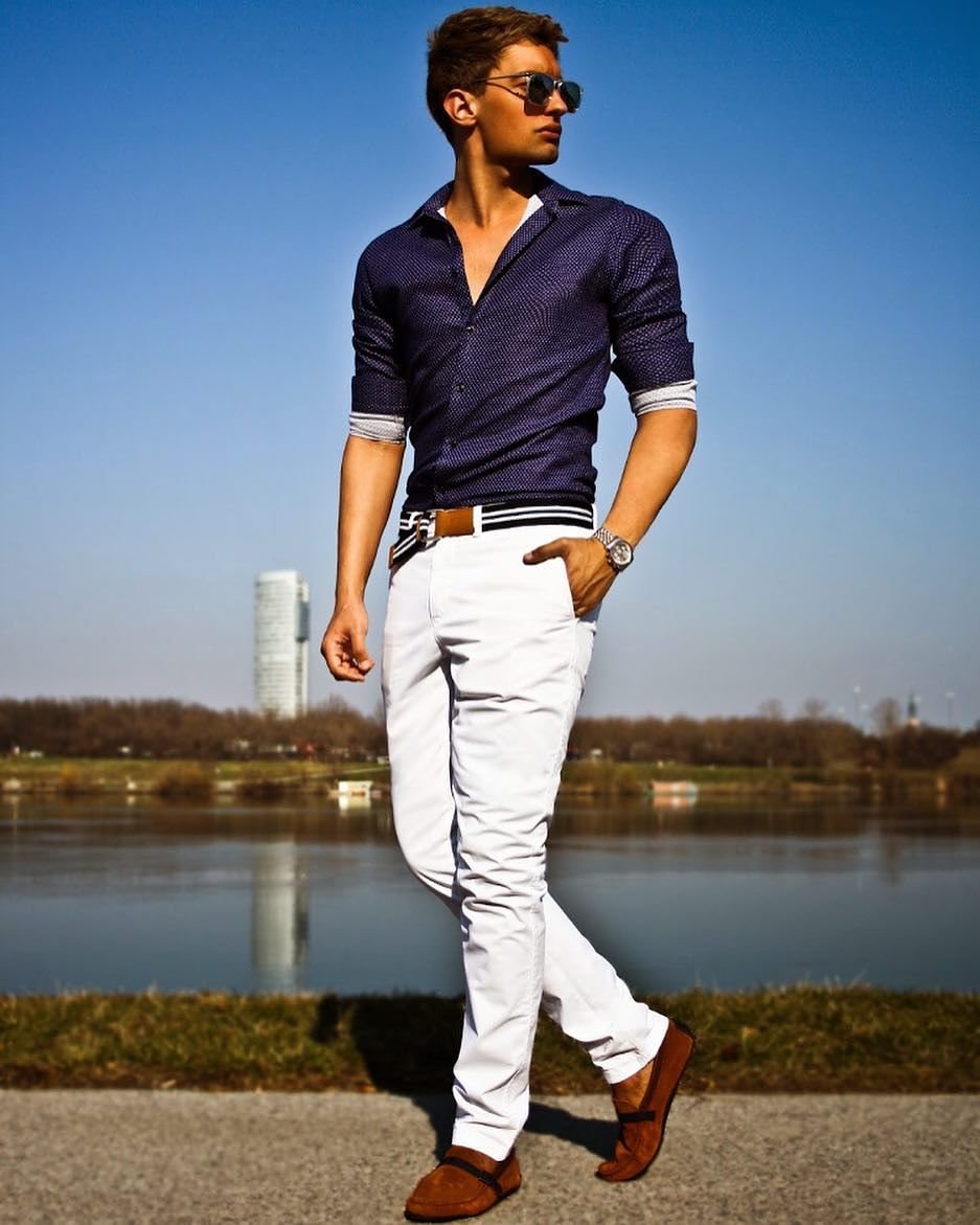- Branco chino - uma opção de verão ideal para um homem jovem e autoconfiante. Costuma-se usá-los esgalgados, combiná-los com camisas ou moletons, complementando-os com uma jaqueta folgada ou uma jaqueta leve curta.