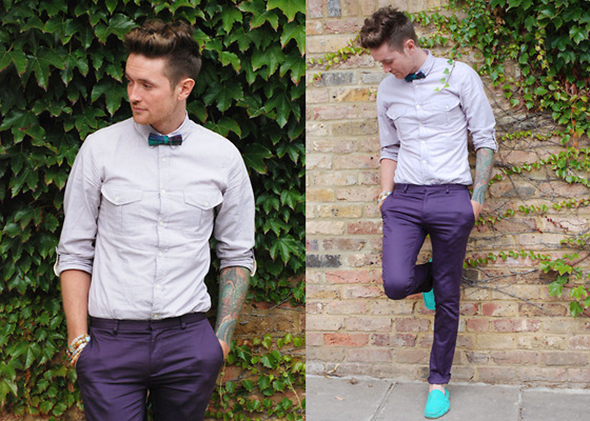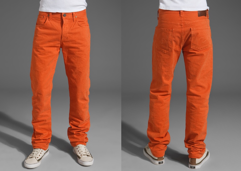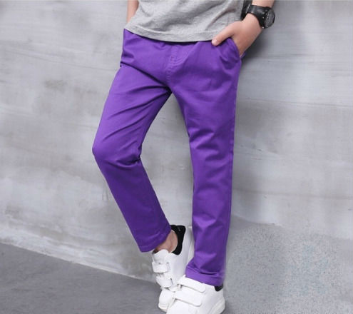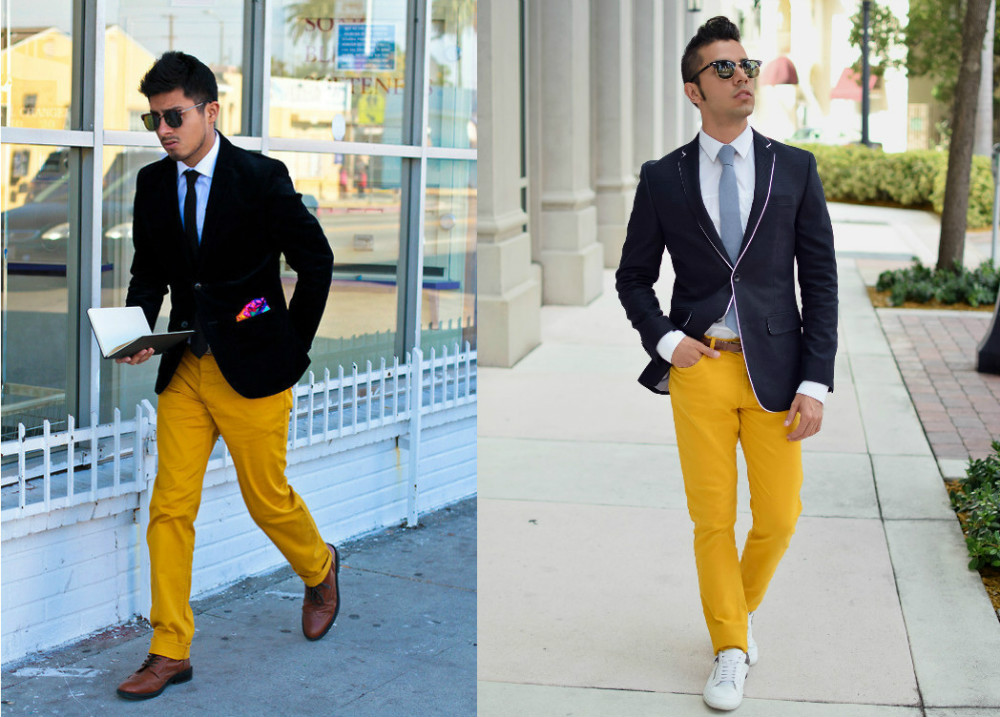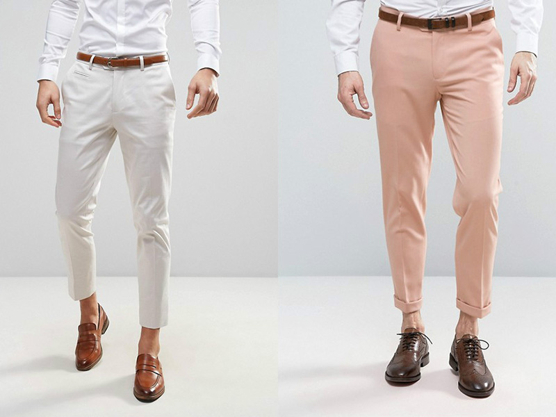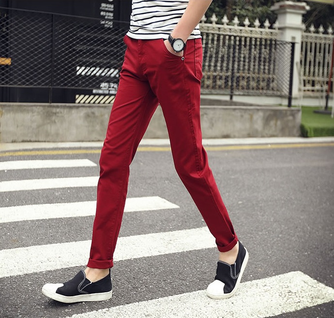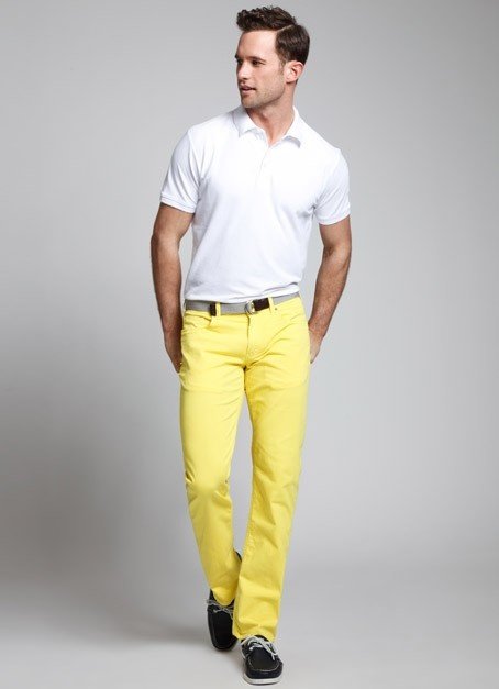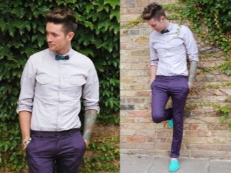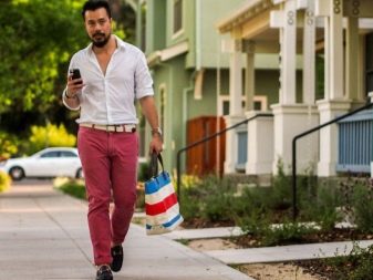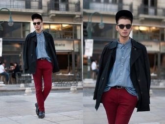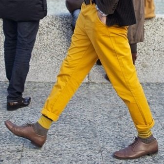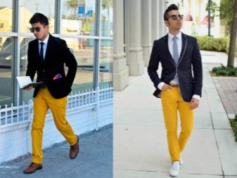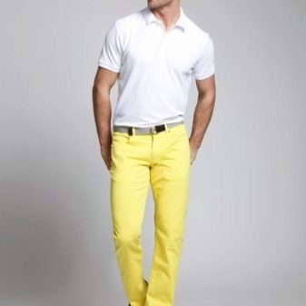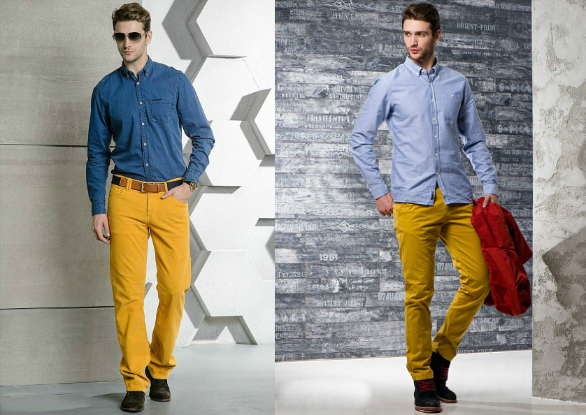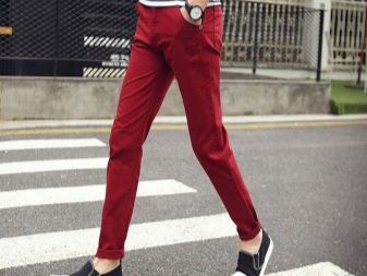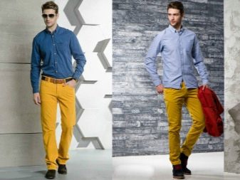 Calças coloridas ficam especialmente impressionantes em um corte estreito ou justo. Homens com sobrepeso na cintura, abdômen, quadris devem evitar cores muito brilhantes. É preferível escolher calças largas em cores mais calmas.