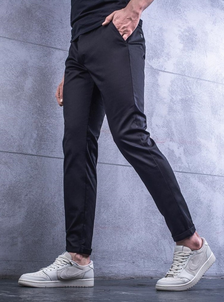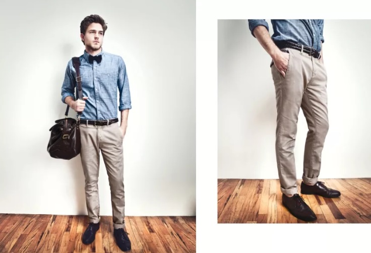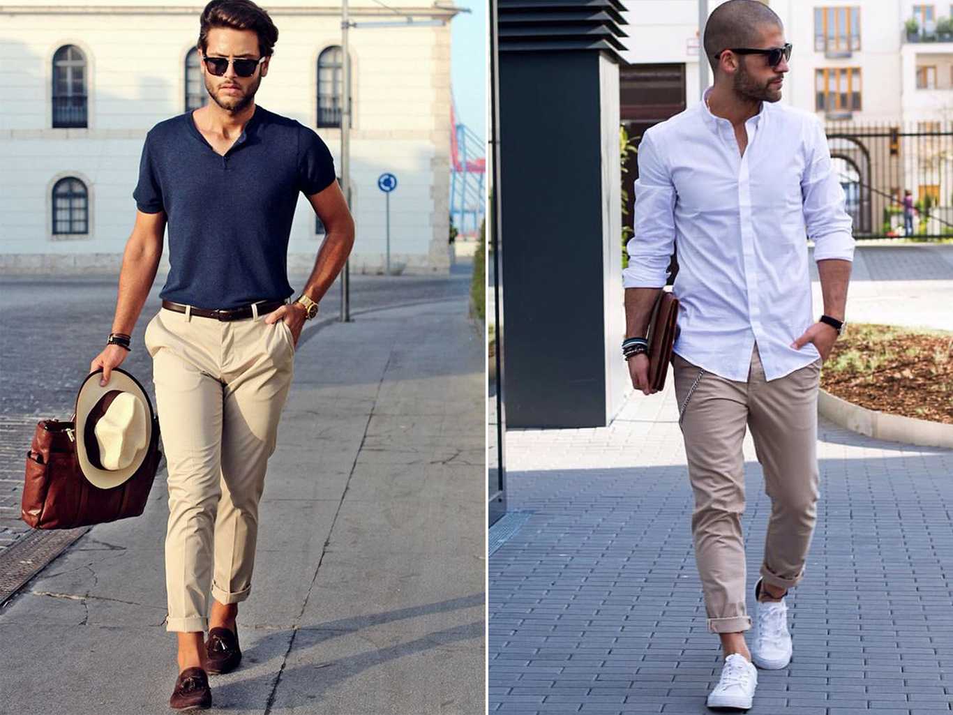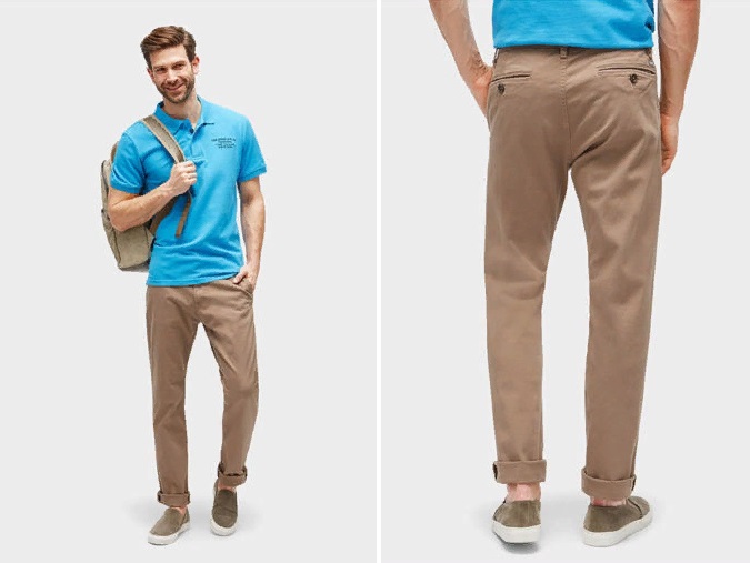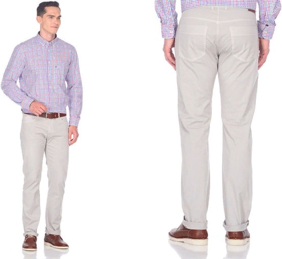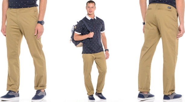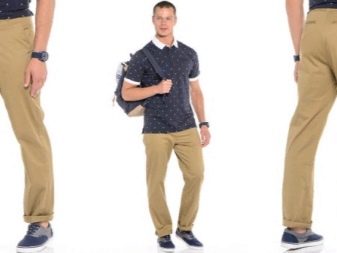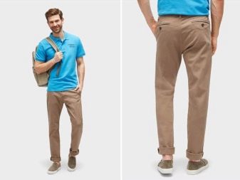 Calças masculinas de estilo casual, especialmente populares entre os jovens. Para o verão, calças cáqui de cores claras - do branco ao arenoso - são relevantes. O patamar é sempre alto ou médio, as pernas são retas em todo o comprimento ou ligeiramente estreitas na parte inferior, com bolsos inclinados na frente e verticais nas costas.
