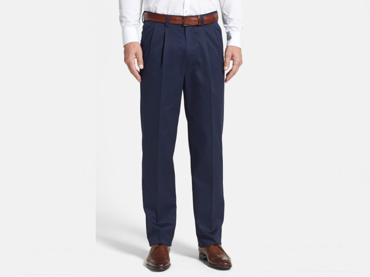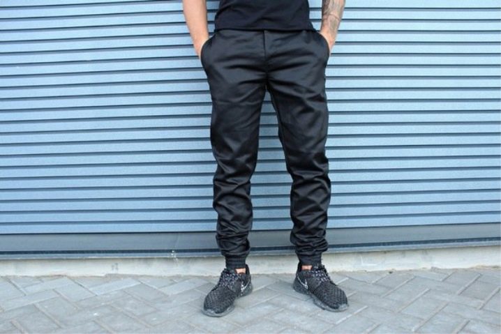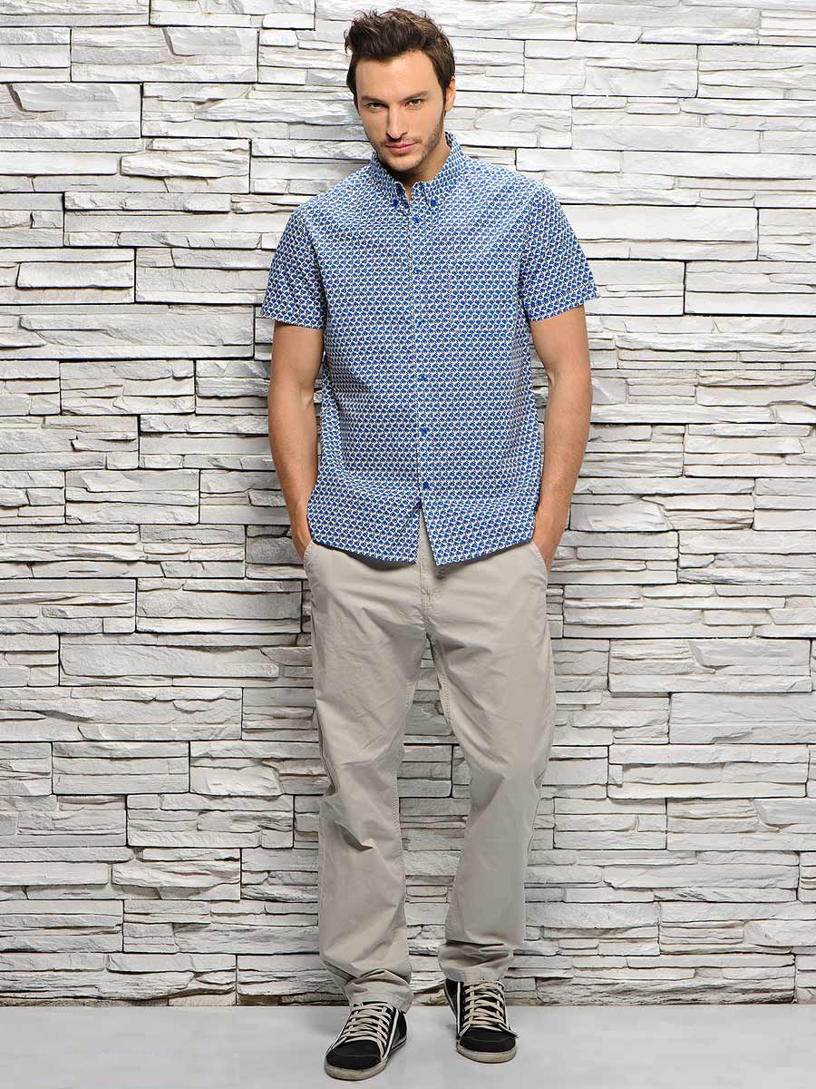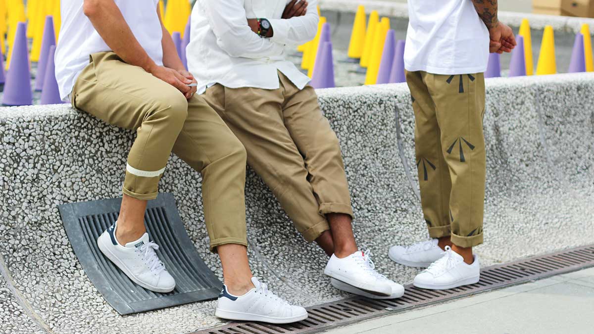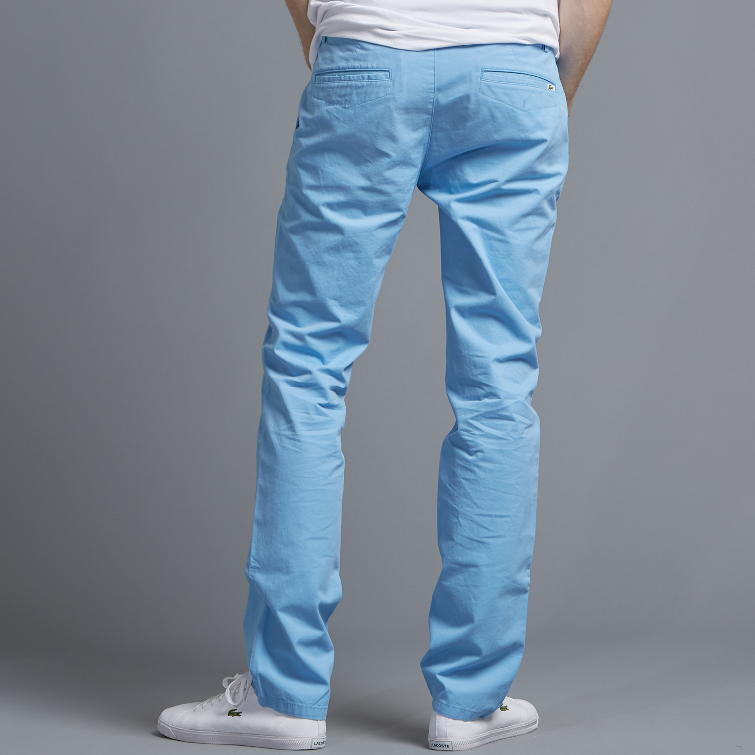 Calças masculinas de estilo casual, especialmente populares entre os jovens. Para o verão, calças cáqui de cores claras - do branco ao arenoso - são relevantes. O patamar é sempre alto ou médio, as pernas são retas em todo o comprimento ou ligeiramente estreitas na parte inferior, com bolsos inclinados na frente e verticais nas costas.
