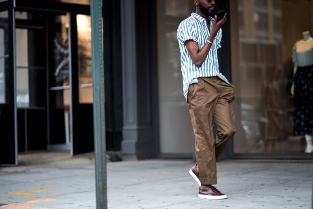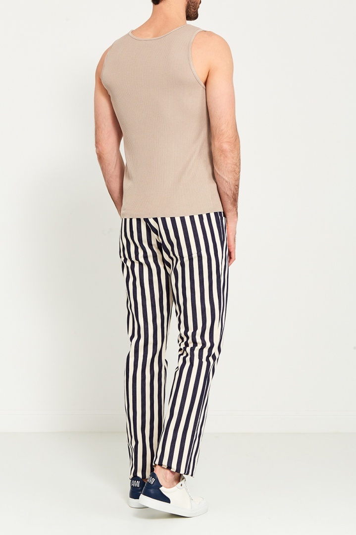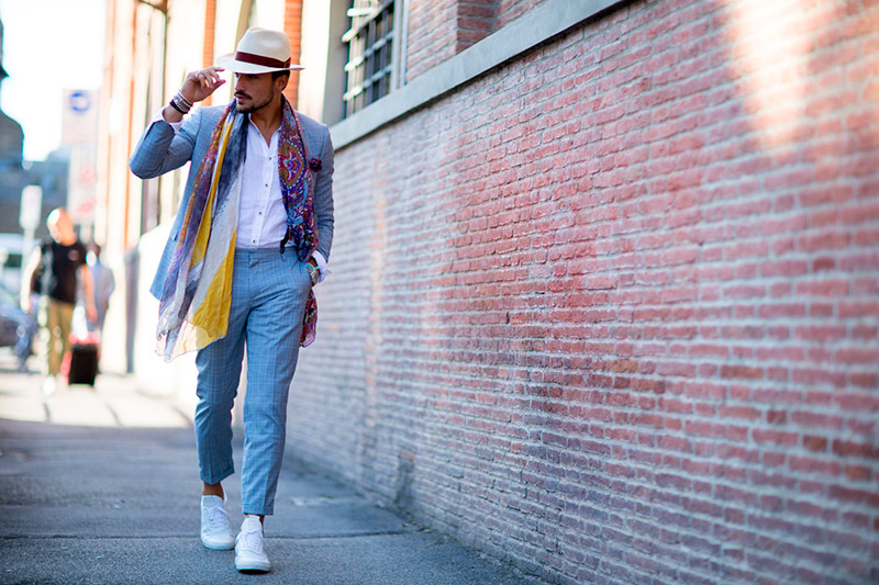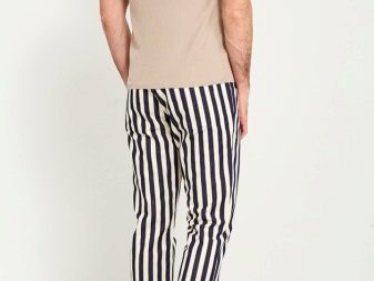Já as estampas de verão relevantes para calças masculinas podem ser uma gaiola (clássica ou xadrez), uma tira vertical em desenho contrastante ou neutro. A tendência é uma combinação de uma larga faixa branca com uma estreita faixa colorida.