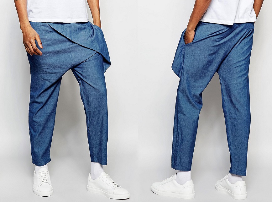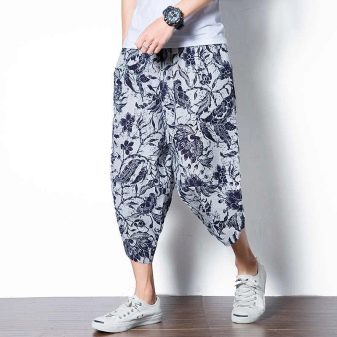 Calça de homem folgada com volume extra na cintura, cintura baixa, bolsos profundos e inclinados nas laterais. Hooligans parecem um híbrido de calças e moletons. Eles podem ter punhos na parte inferior ou um pequeno elástico que amarre a borda da perna. Para o verão, você deve escolher um modelo feito de viscose ou algodão misturado com outros materiais.