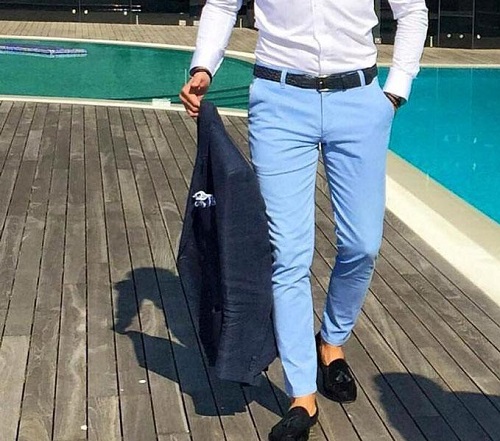 - Fato terno de lã. A temporada de verão geralmente requer a participação em recepções, casamentos e outros eventos com um código de vestimenta claro e bastante rígido. Neste caso, calças de fato de lã bem ajustadas na elegante cor branca ou azul claro serão indispensáveis e irão salvá-lo facilmente do frescor da noite.