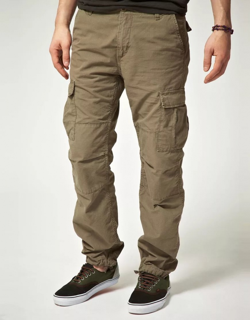 Esse estilo no corte de calças se expressa no uso de bolsos inclinados e nas pernas retas ou estreitas. O corte proporciona um comprimento clássico, ajuste médio e altura. O militar é caracterizado por uma cor cáqui, que em uma versão monocromática é bastante adequada para o escritório ou uso diário.
