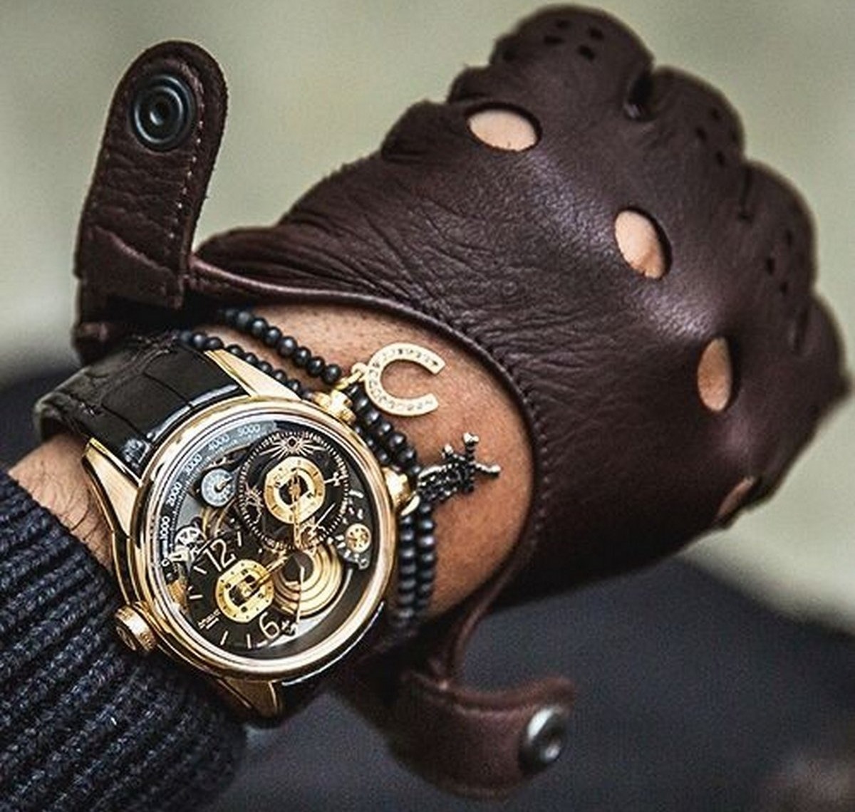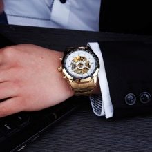 Marcas caras e respeitáveis de relógios esqueleto criam seus produtos tendo em vista os representantes da comunidade empresarial. Neste caso, eles são colocados com calças e jaquetas xadrez, luvas de couro e camisas perfeitamente passadas. Nesse caso, o relógio foi escolhido com tamanho suficiente para ser visto por baixo do punho.