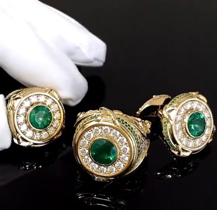 Os anéis masculinos são acessórios estilosos que complementam perfeitamente o seu visual. A combinação de ouro e esmeralda parece nobre e sólida. Os anéis e os lacres diferem em design, por isso é fácil combinar joias com estilos de negócios e do dia a dia.
