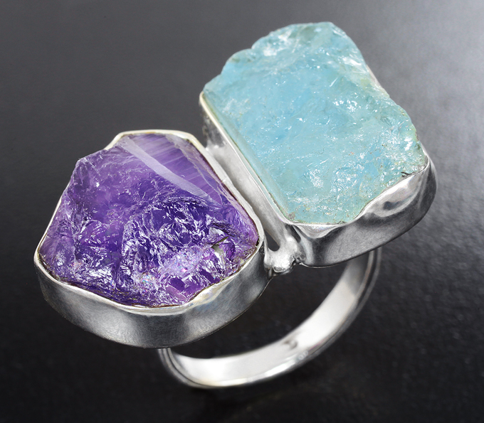 É permitido combinar ametista com outras pedras, muitas vezes da cor absolutamente oposta. Os selos decorados com vários minerais parecem espetaculares. Essas combinações tornam as joias mais originais. Na maioria dos casos, a ametista é colocada no centro do anel, enquanto outras pedras são colocadas ao longo das bordas. Na maioria das vezes, esta gema é combinada com água-marinha, topázio, turquesa.