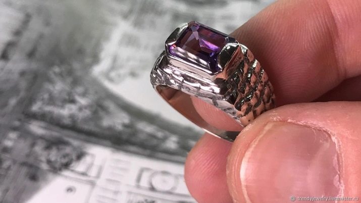 Ao escolher um anel com ametista natural, você deve prestar atenção ao estilo de vida do homem. Se um representante do sexo forte é um convidado raro em eventos, as joias com uma grande pedra serão guardadas em uma caixa na maior parte do tempo. Nesse caso, é melhor comprar uma joia discreta com uma pedrinha. Para os homens que levam um estilo de vida secular, um selo com uma grande joia é adequado.
