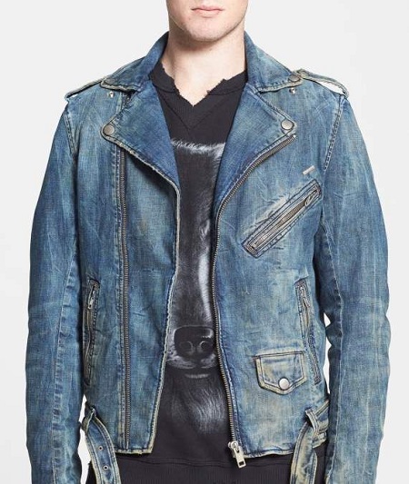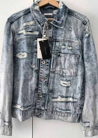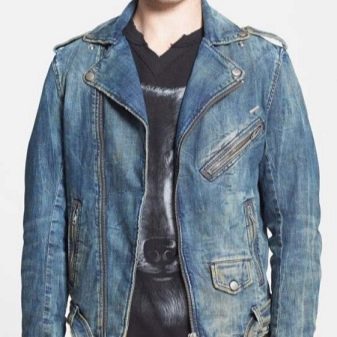 - Jaqueta de motoqueiro desbotada - esta é uma versão brilhante e original. Jeans neste estilo sem falha tem um zíper oblíquo na frente, pode ser complementado com um cinto na parte inferior da jaqueta. Para aumentar o impacto, muitos designers adicionam bolsos laterais com zíper, junto com um zíper na parte inferior da manga.