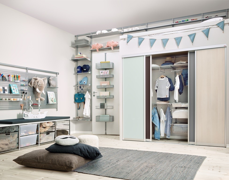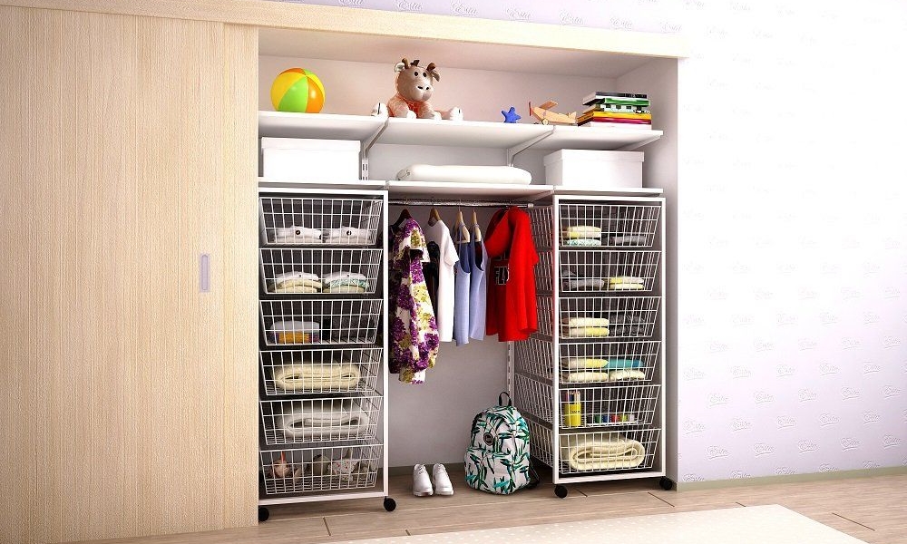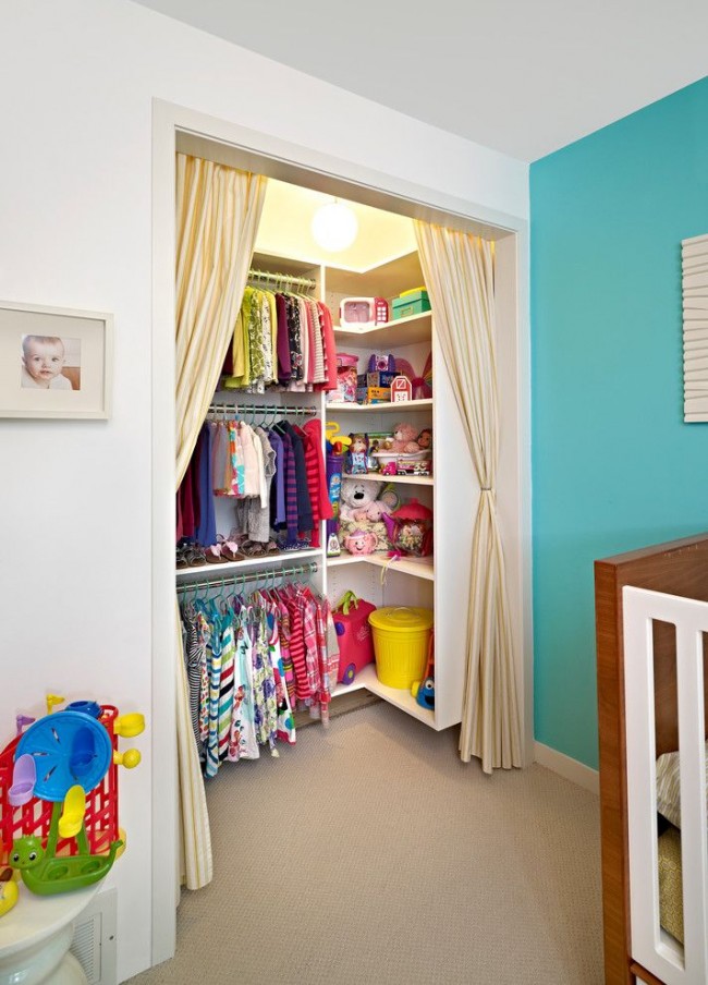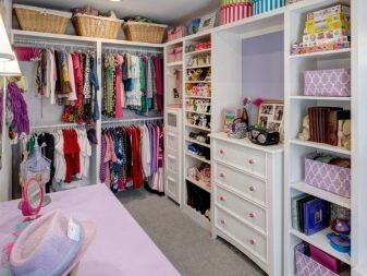 Em camarins espaçosos, você precisa fornecer contêineres separados para guardar brinquedos, designers, livros.