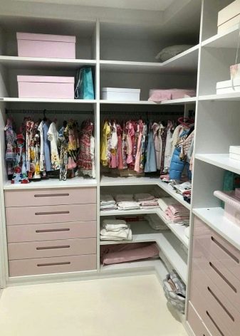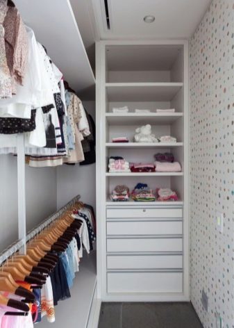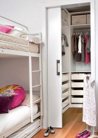 - Em um camarim tão espaçoso, onde armários, prateleiras e gavetas são fornecidos, haverá espaço suficiente para duas crianças. Há um lugar para colocar as coisas e para encaixar.