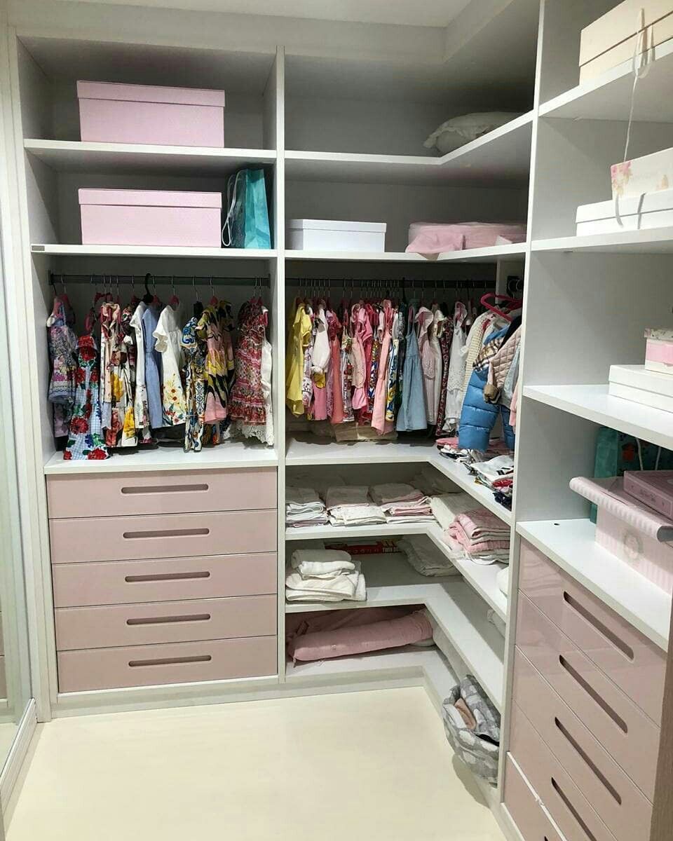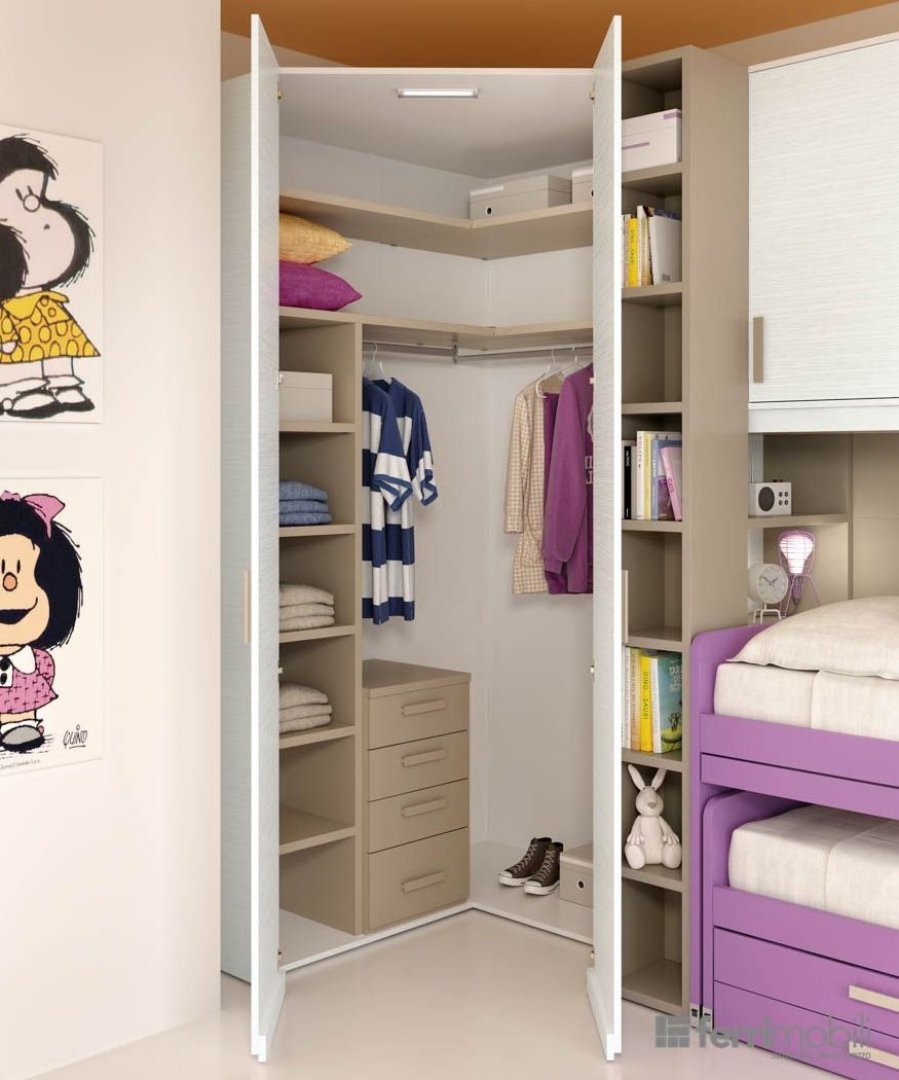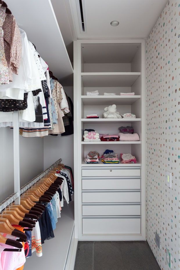 Se esta não for uma sala separada, então um guarda-roupa grande e muito espaçoso deve ser colocado perto de qualquer uma das paredes, que irá abrigar todas as coisas, roupas e até mesmo brinquedos parcialmente.