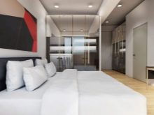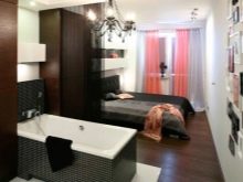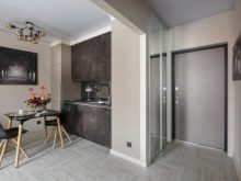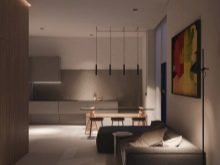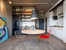 O design neste estilo parece relativamente simples e a implementação da renovação leva muito menos tempo. Você pode usar com segurança os materiais ou móveis mais baratos. Ele é escolhido para pequenos apartamentos (20, 28, 34 sq. M.).