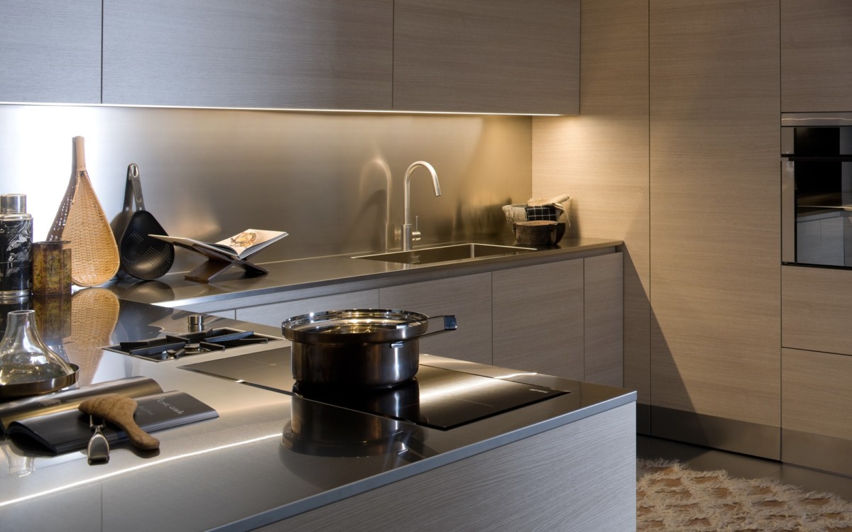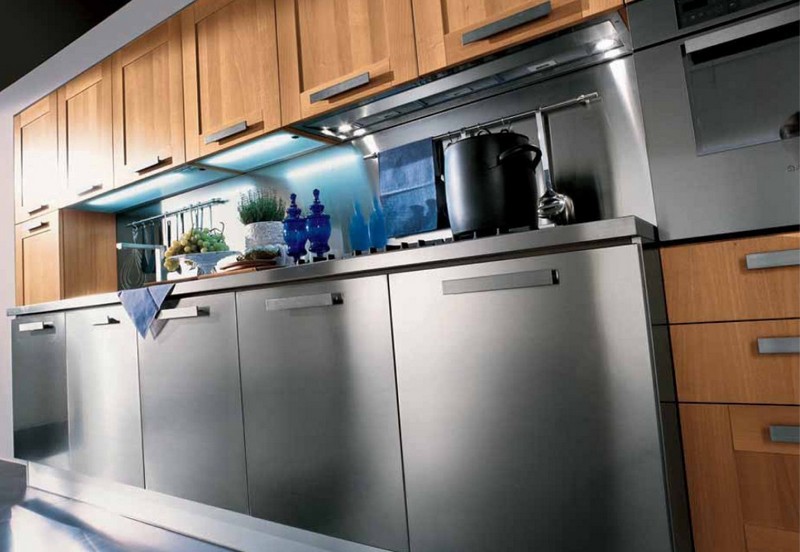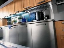 Existem opções não apenas para uso único de peças metálicas no interior. A criação de uma cozinha toda em metal está ganhando cada vez mais popularidade, o que se correlaciona perfeitamente com a tendência para o minimalismo.