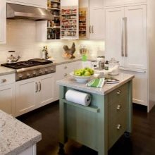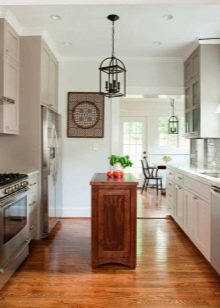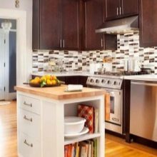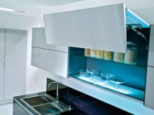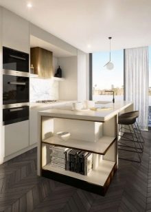 As "ilhotas" em design moderno não são apenas um elemento de design funcional, mas também um sistema de armazenamento conveniente. Graças a eles, você pode abandonar completamente os armários de cozinha usuais ou minimizar seu número. "Ilhota" pode ser criada em qualquer estilo, e a bela iluminação interna criará um ambiente aconchegante.