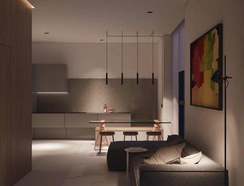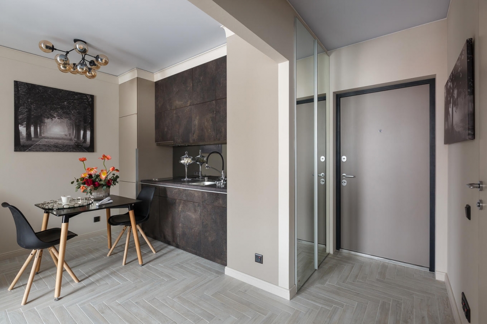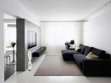 O minimalismo é lacônico e conceitual, adequado para apartamentos de 42, 43 ou 45 m². m. Este estilo é caracterizado por: design em cores discretas e o uso frequente das cores branco, cinza e preto. Um dos materiais mais populares para decoração neste estilo é o parquet branco. O grés porcelânico é frequentemente usado, repetindo a textura do mármore.