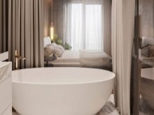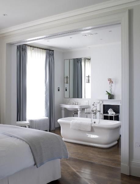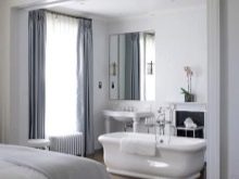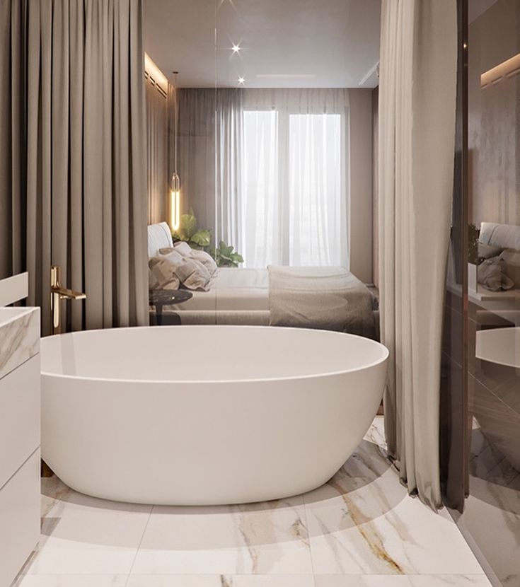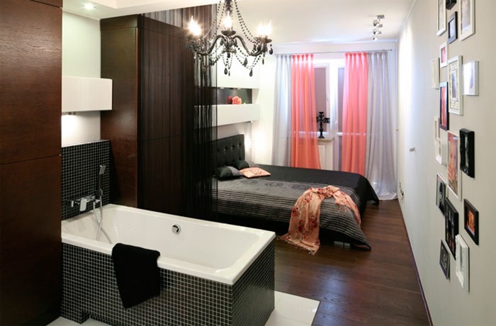 Com o zoneamento adequado do espaço, o banheiro pode se tornar uma continuação lógica do quarto. A ausência de limites claros como se expande o espaço, forma um canto separado de conforto e relaxamento. Com este layout, a banheira torna-se um belo acento visual, adicionando um visual holístico e interessante ao interior geral.