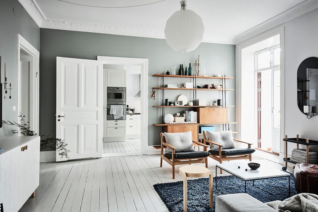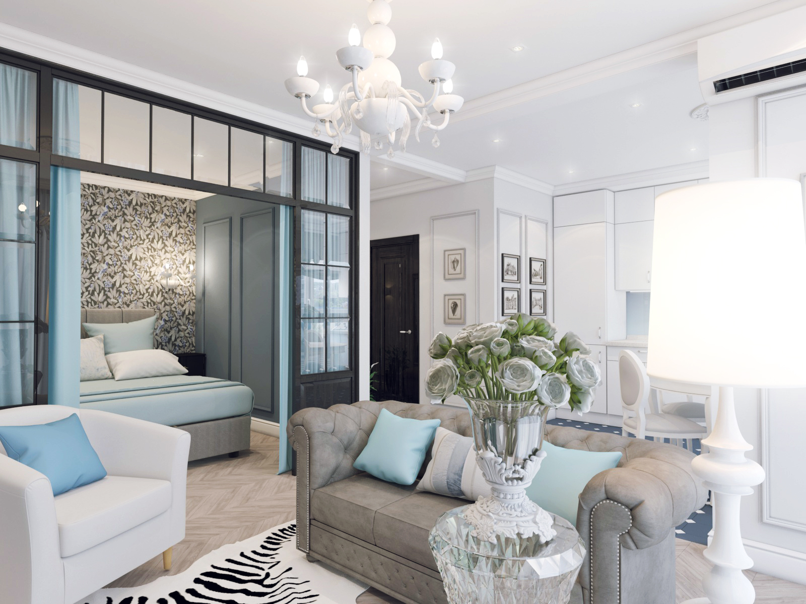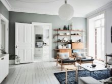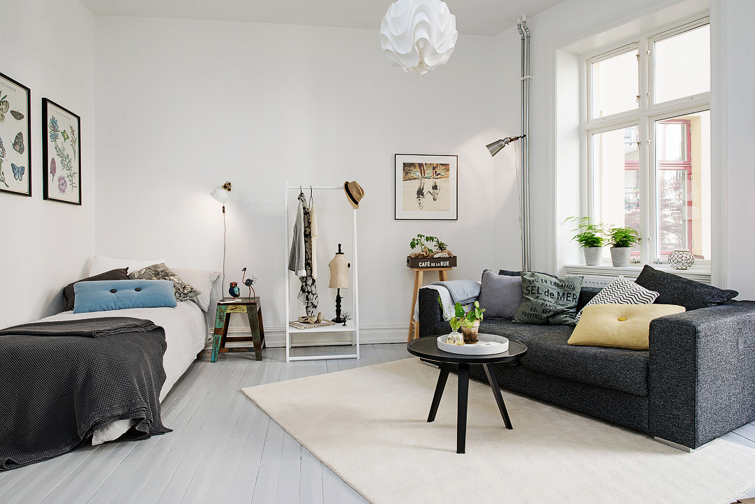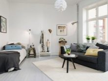 Uma tendência muito popular quando se trata de design de apartamentos de um quarto. A gama de luz, que é usada no estilo escandinavo, expande visualmente o espaço. Você pode diluir tons pastel com alguns detalhes brilhantes.