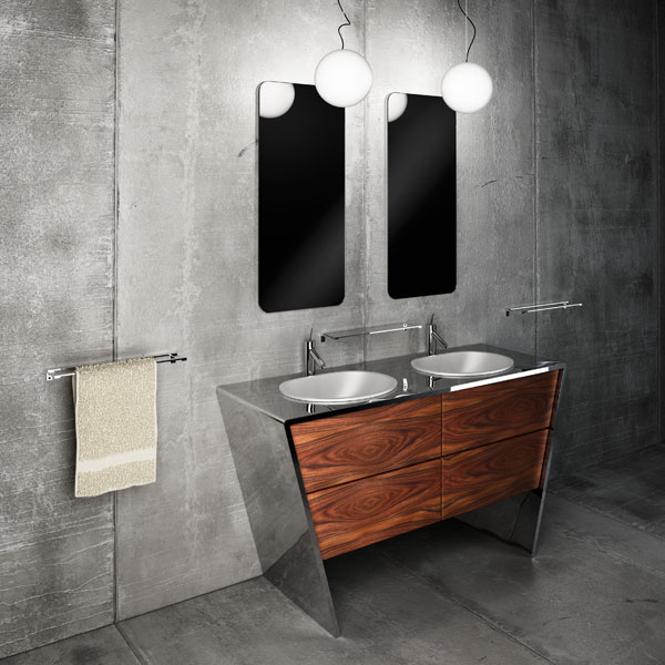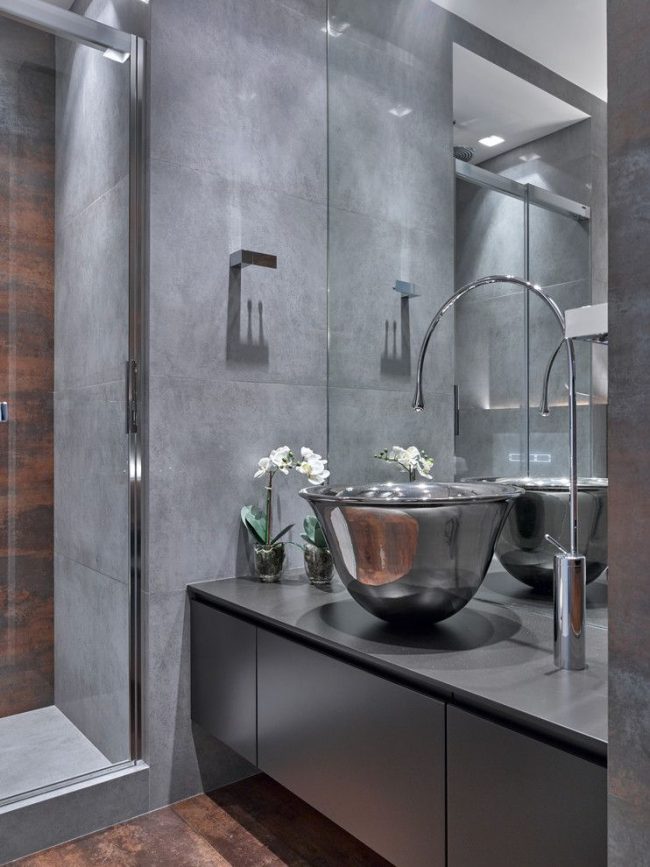 Toda a beleza do metal é mais relevante do que nunca no interior de um banheiro moderno. No entanto, mesmo aqui, os consoles de metal usuais substituíram variações de fosco interessantes.