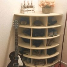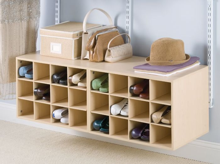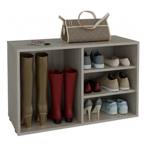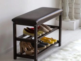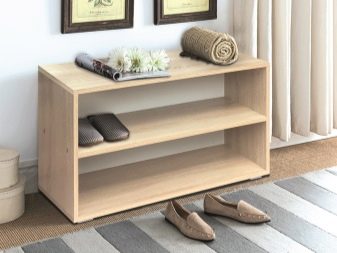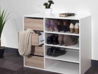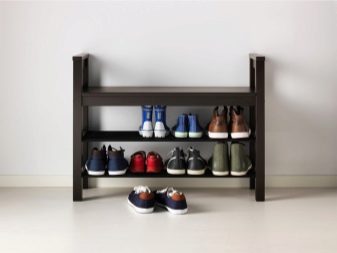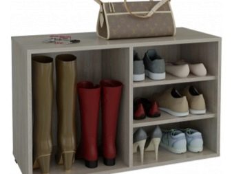 Esses projetos de armários de sapatos são extremamente simples. Em seu dispositivo, existem apenas duas partes laterais, às quais são fixadas prateleiras de diferentes tamanhos. Eles são baixos, médios ou altos.