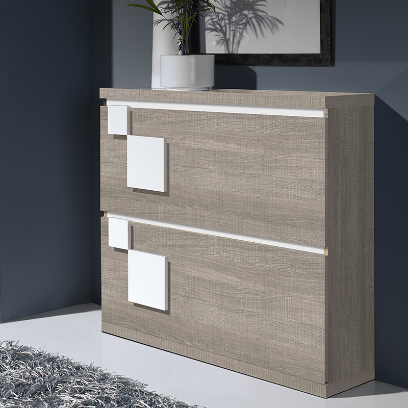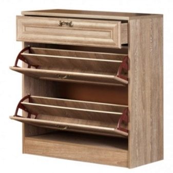 Os mais baratos são os porta-sapatos de aglomerado. Este é um material simples e barato, a partir do qual a mobília é feita predominantemente com modelos de design. Ao adquirir tal modelo, você deve certificar-se de que material da classe E-1 ou E-0 foi utilizado em sua produção. É nessas matérias-primas que está contido o formaldeído menos prejudicial, cujos vapores podem afetar negativamente a saúde das famílias.