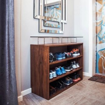 Os armários abertos para sapatos parecem discretos e elegantes. Visualmente, eles não parecem muito grandes, então eles se encaixam muito bem em quartos pequenos. Os sapatos, por estarem nas prateleiras abertas, são sempre bem ventilados. Isso evita o aparecimento de odores desagradáveis, bem como o acúmulo de umidade excessiva. No entanto, pelos mesmos motivos, os sapatos armazenados abertos estão completamente desprotegidos.