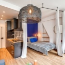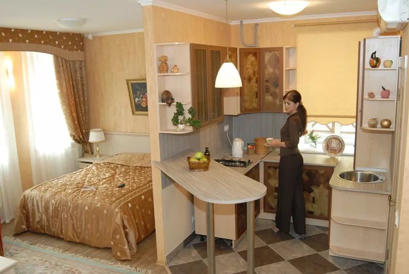 É difícil encontrar uma combinação menos adequada do que uma cozinha com um quarto. O layout tradicional dos apartamentos envolve uma divisão entre a área de dormir e a área de cozinha. No entanto, nos últimos anos, os apartamentos tipo estúdio tornaram-se corriqueiros para os residentes das megalópoles, que aprenderam a distribuir corretamente o espaço e a eliminar o desconforto na divisão conjunta do quarto com a cozinha.