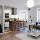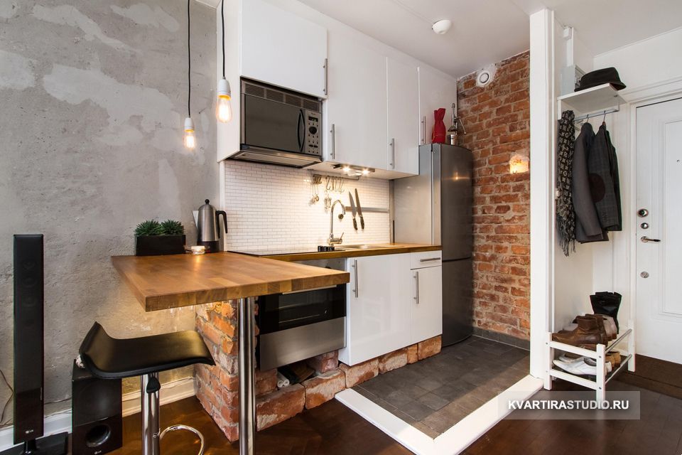 - ilha - uma opção clássica para combinar uma cozinha com um quarto ou sala de estar. A ilha funciona também como uma área de jantar, espaço de armazenamento para utensílios de cozinha e uma divisória entre a cozinha e o quarto.