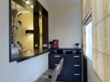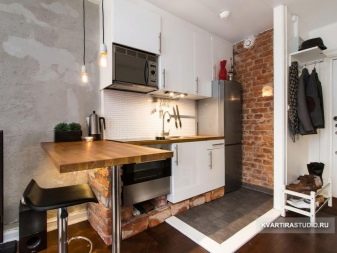 Uma mesa de centro transformadora permitirá que você receba plenamente os convidados e, depois que eles saírem, dobre a mesa de jantar. Em apartamentos pequenos, é aconselhável usar armários altos e prateleiras verticais para garrafas, comida enlatada e utensílios de cozinha.