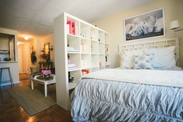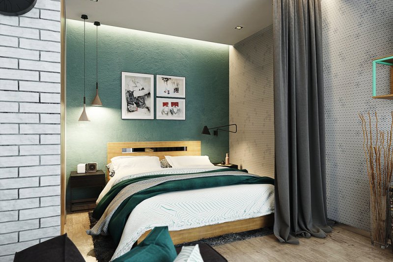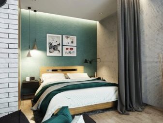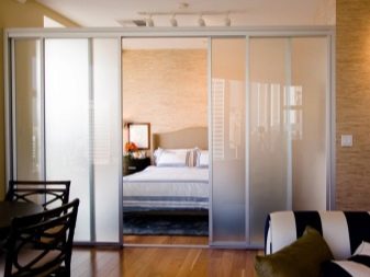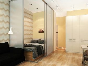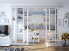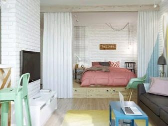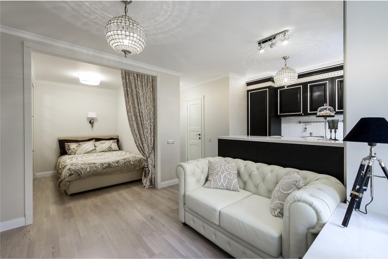 Uma questão importante é a separação da área de dormir da cozinha. Para fazer isso, você pode usar 2 tipos de técnicas: com e sem reparos.