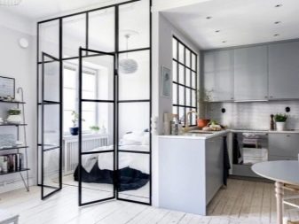 - Divisória de vidro - uma opção de zoneamento esteticamente agradável e leve que não bloqueia a luz do dia no espaço da cozinha.