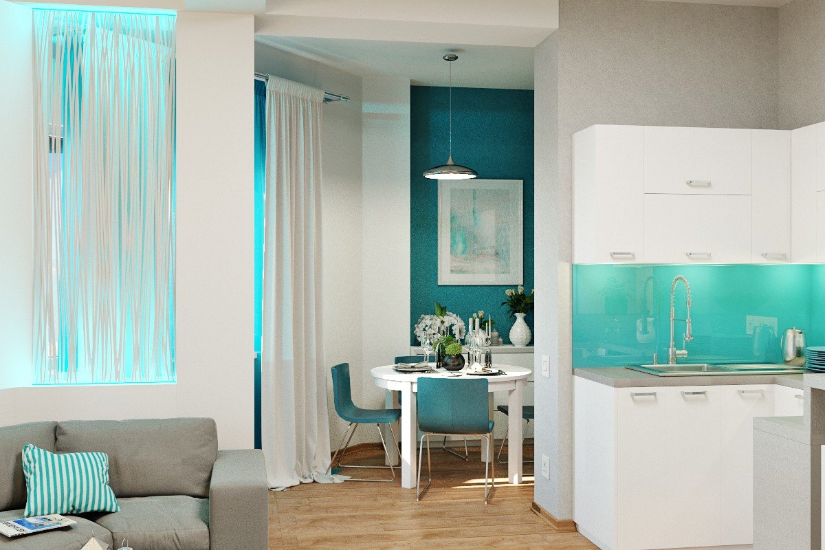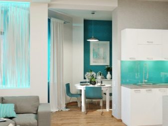 Você pode decorar a sala usando uma combinação de 1 - 2 cores em diferentes versões. Por exemplo, as combinações branco-azul, branco-turquesa e branco-cinza funcionam muito bem. Na cozinha, você pode colocar ladrilhos em uma cor turquesa brilhante em vez de um avental, e no chão você pode usar ladrilhos brancos. Ao mesmo tempo, você não deve adicionar cores brilhantes à área de lazer, você pode substituí-los por tons turquesa claro mais contidos em combinação com palha ou laminado de prata. Tapetes cinza-esbranquiçados ou bege, vasos brancos com motivos geométricos, cortinas romanas em tons turquesa ajudarão a complementar o design.